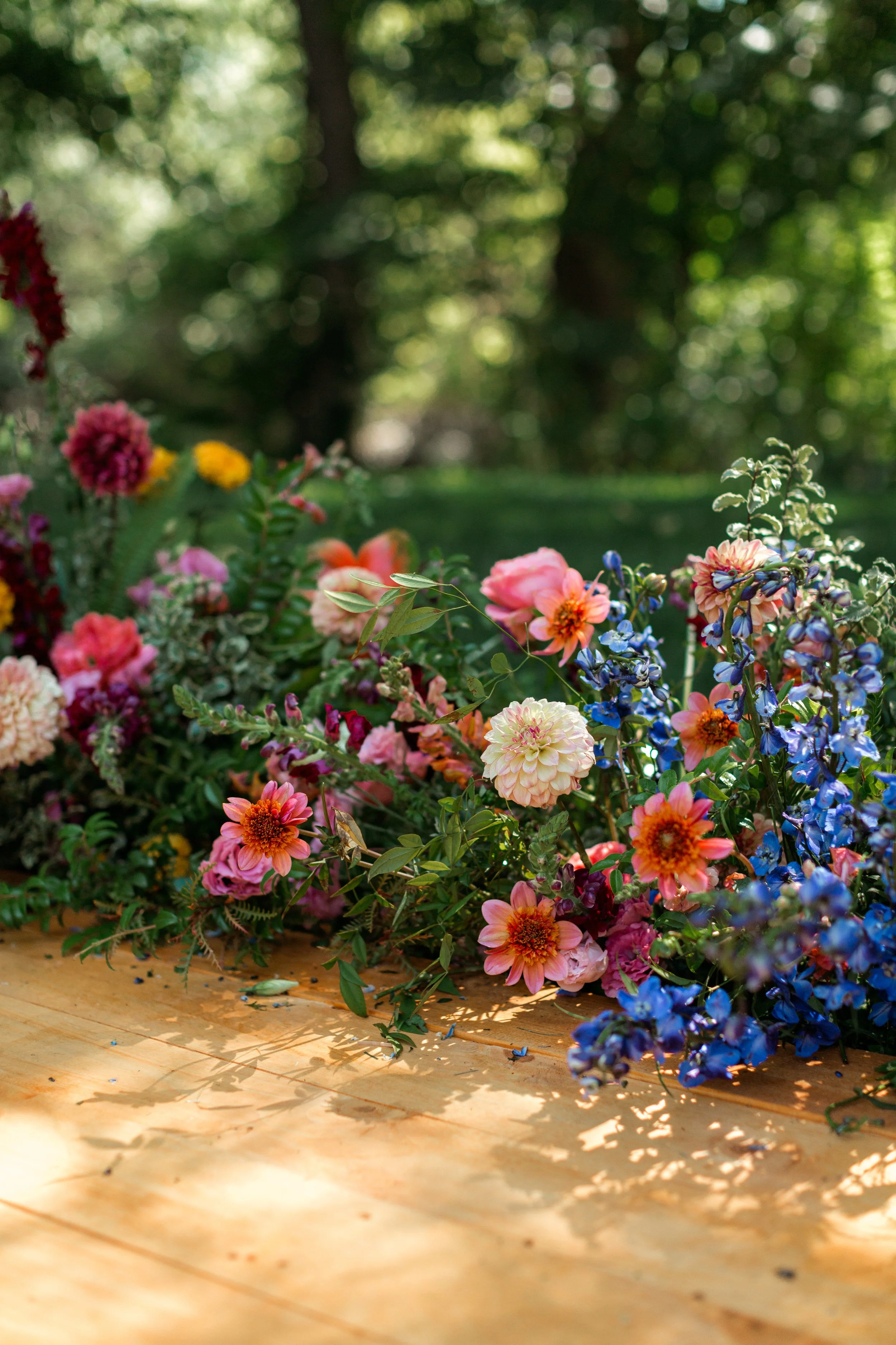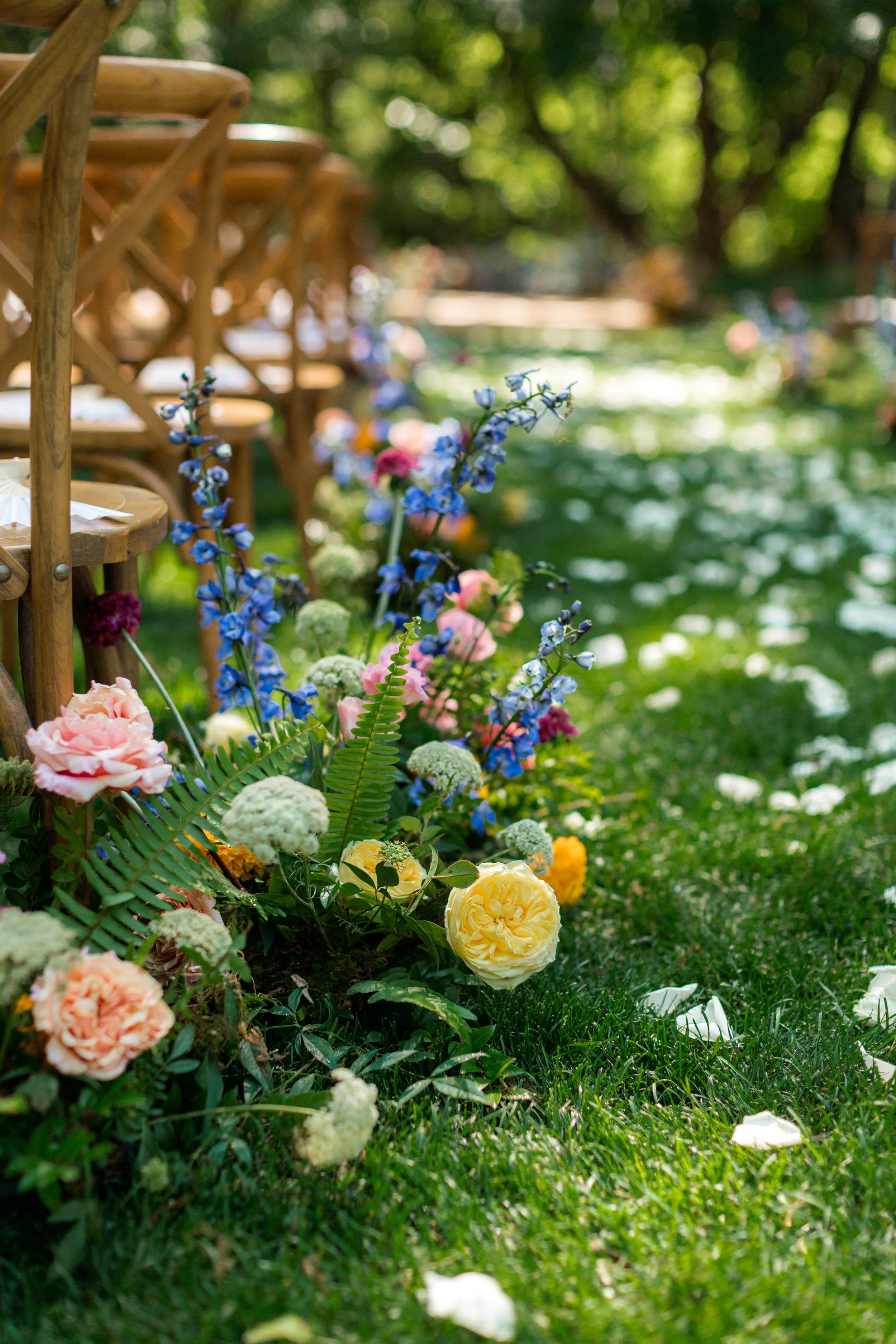 Outdoor floral arrangement with pink roses, wildflowers, greenery on grass