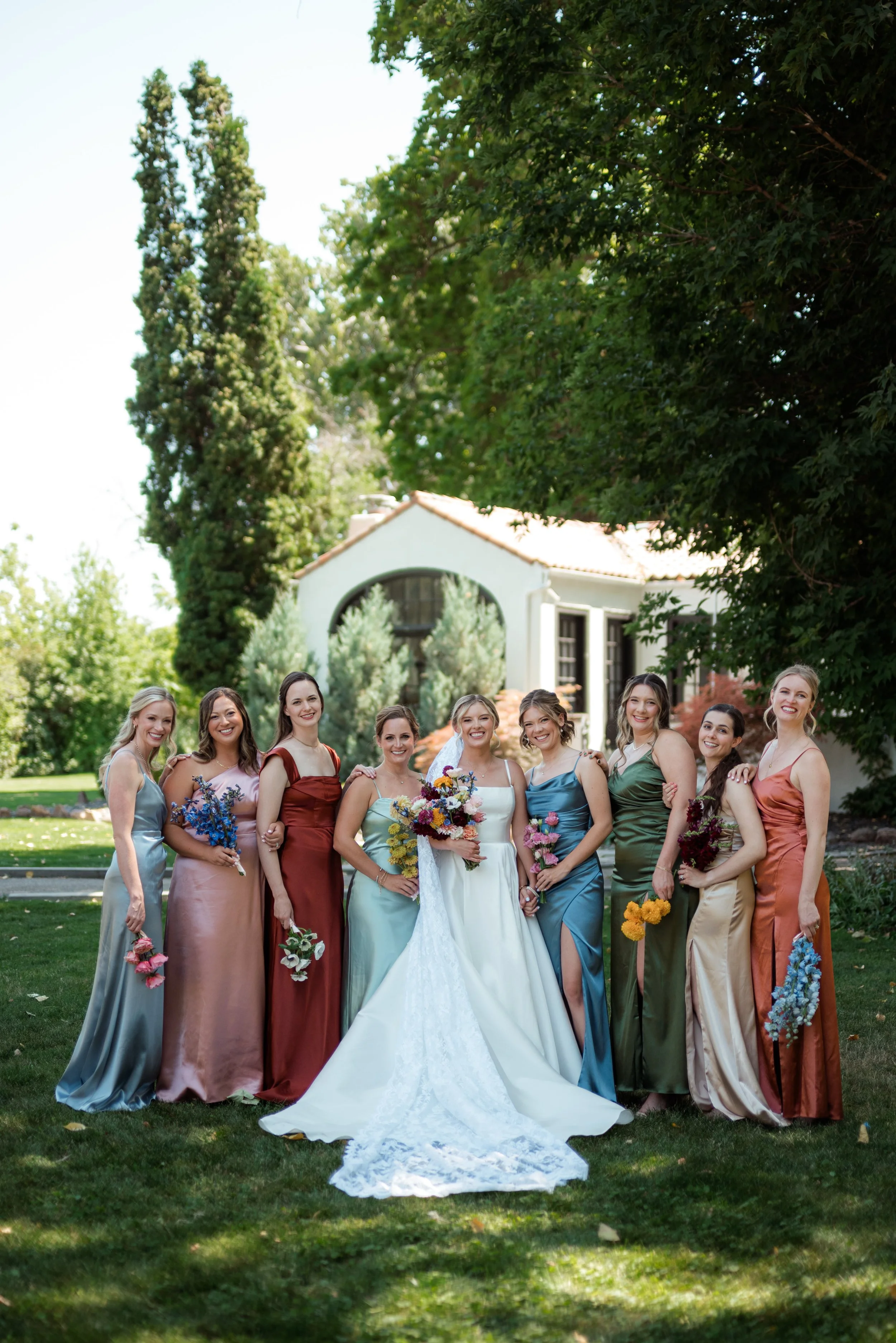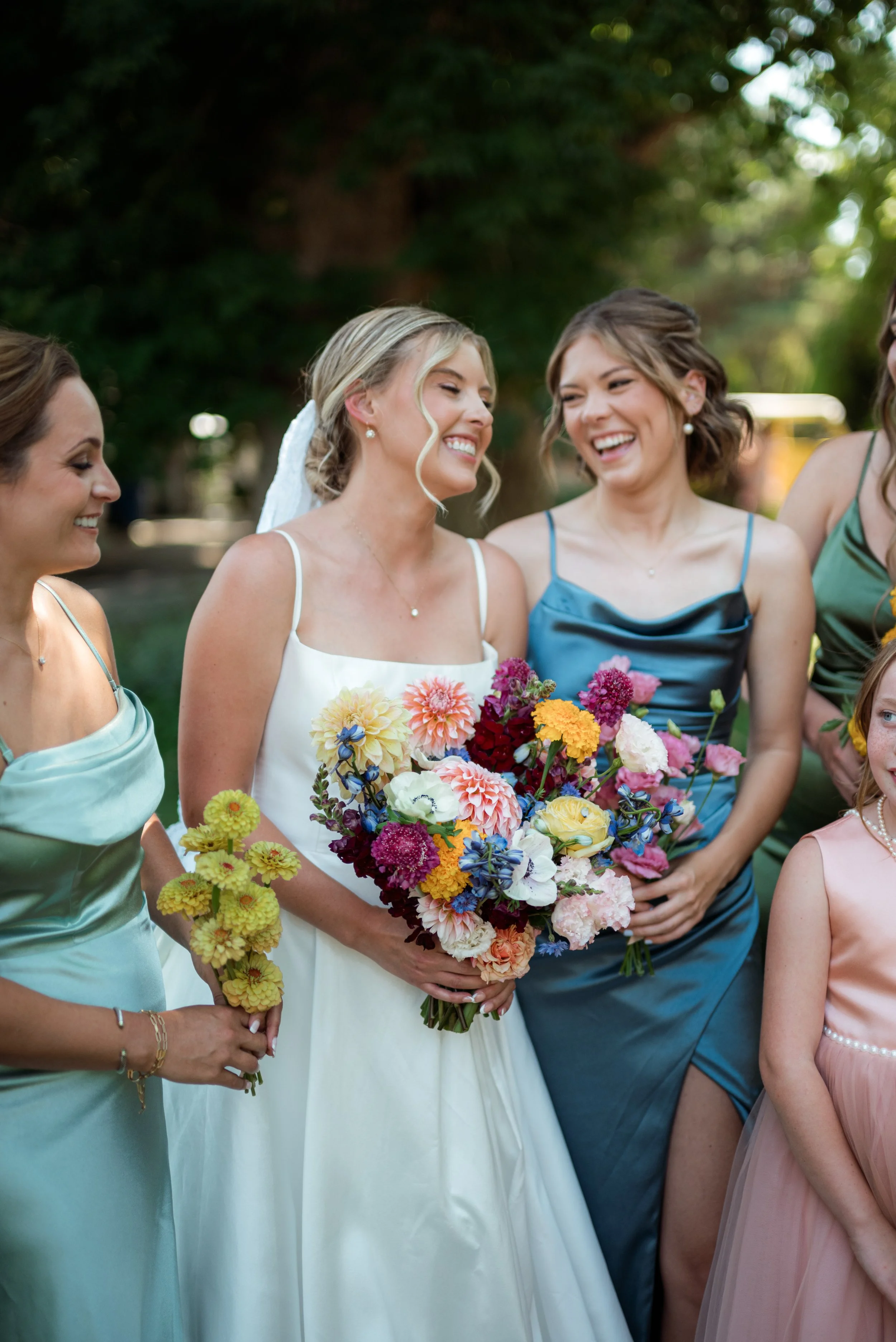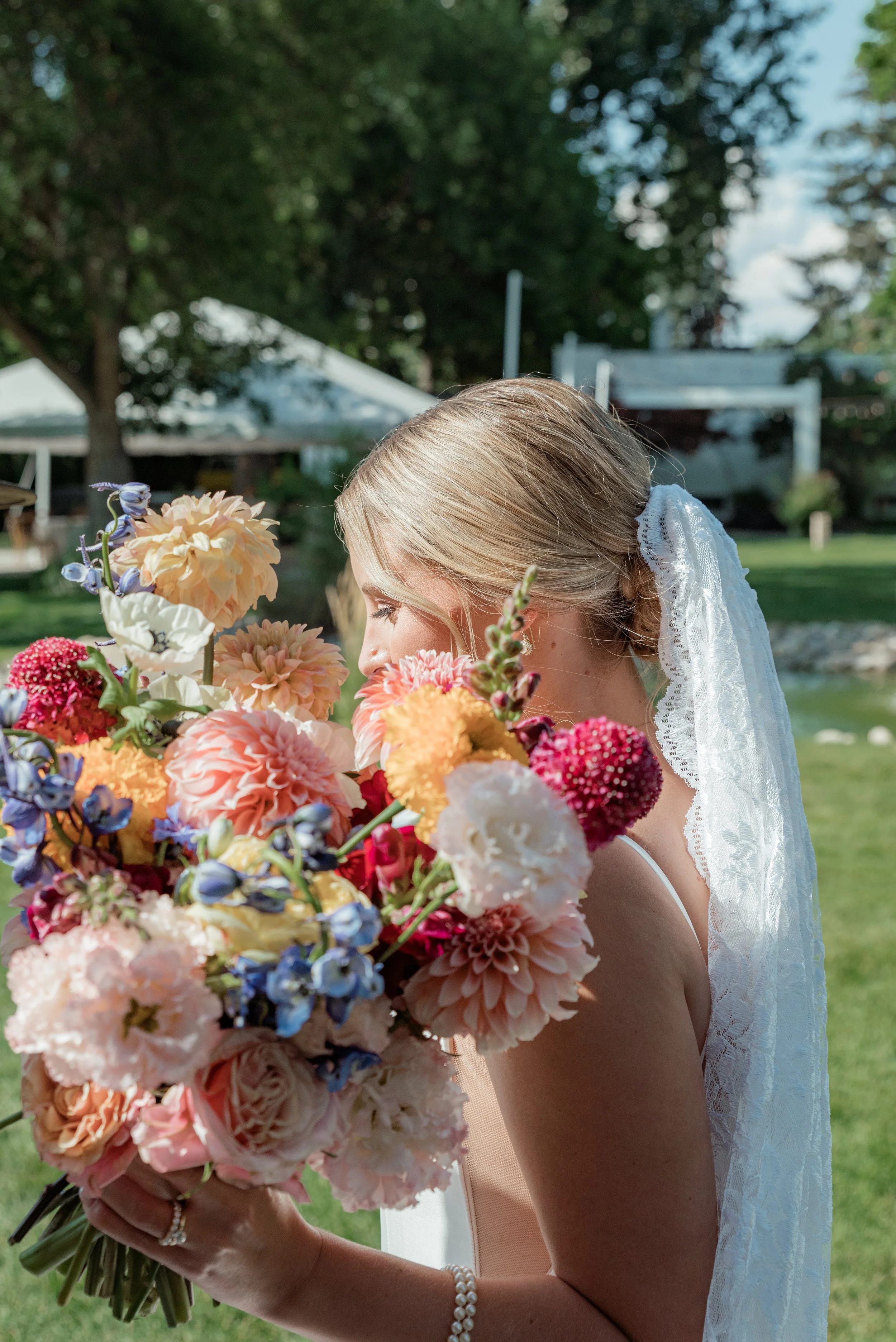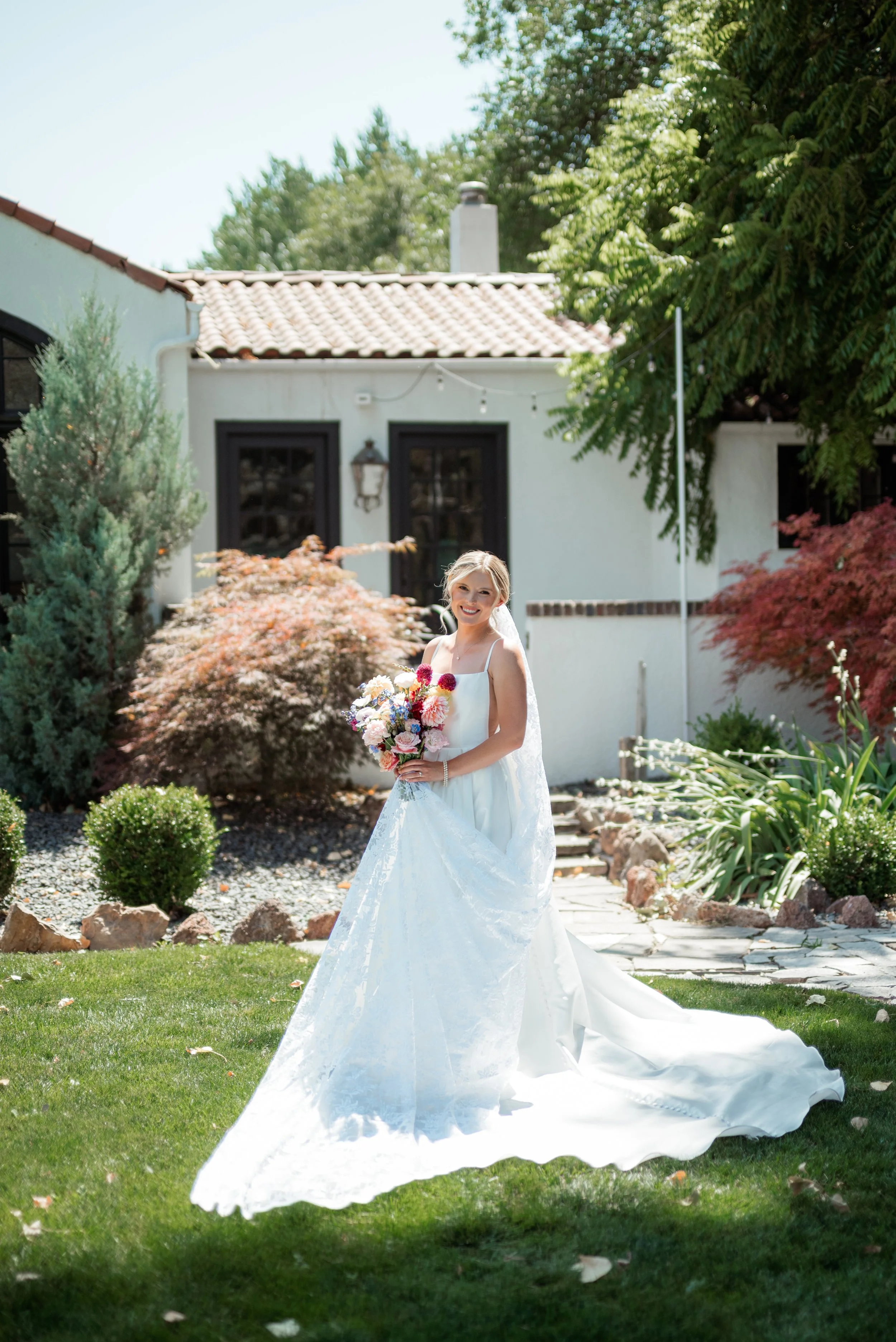 Bride in white dress holding colorful bouquet, standing in front of a house with green lawn and trees.