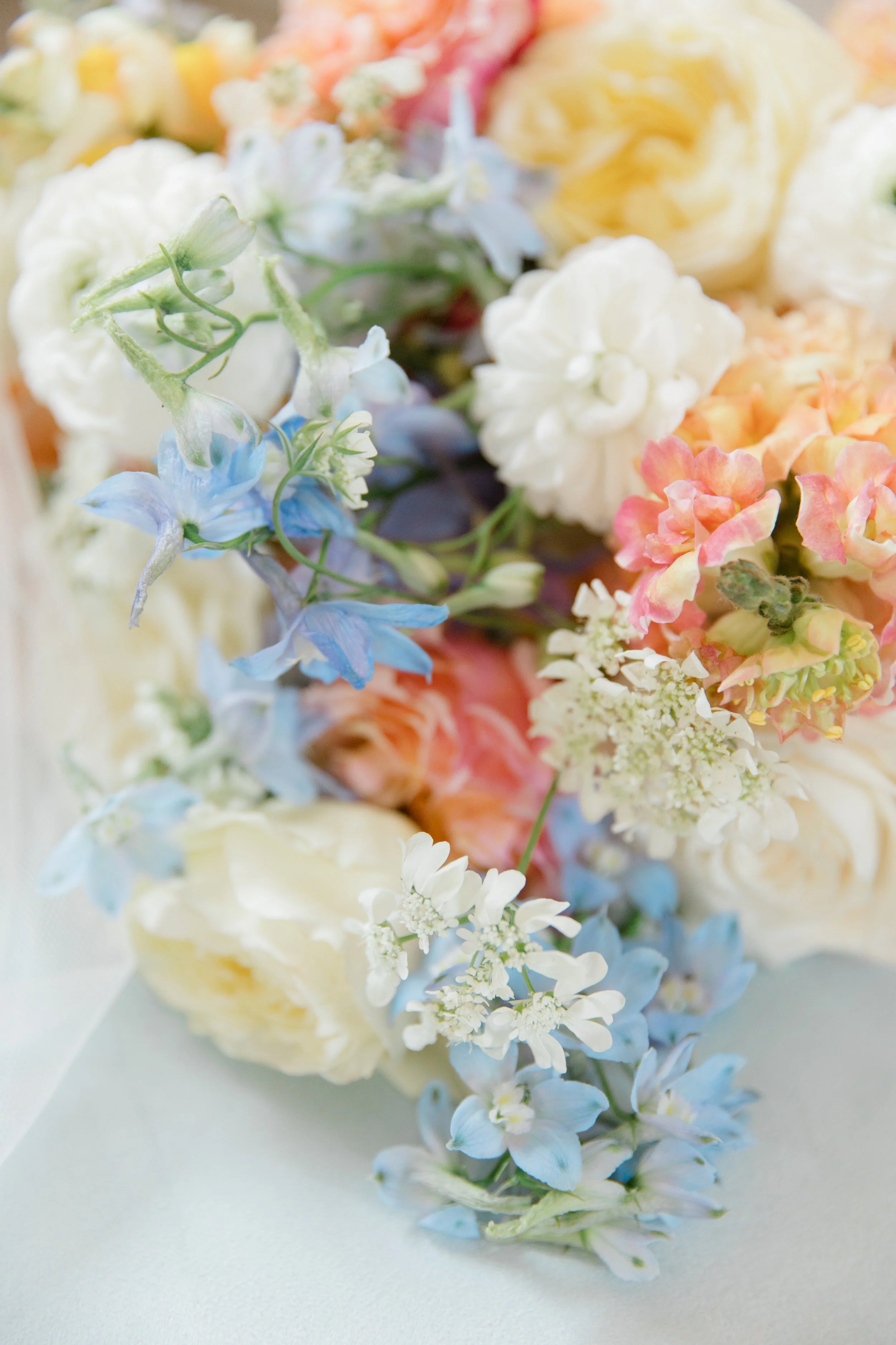 Floral arrangement with white roses, lavender, and blue delphiniums on grass.