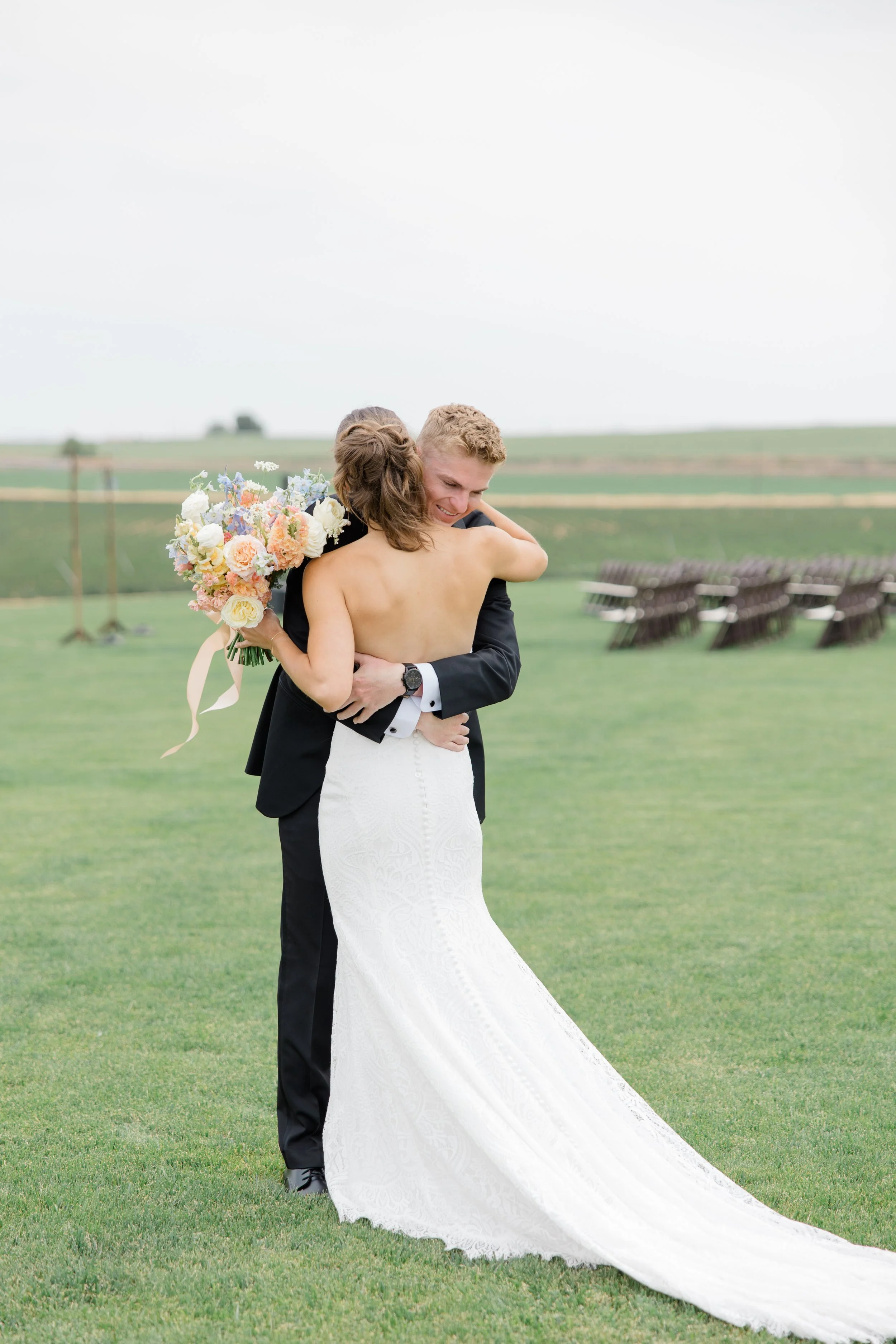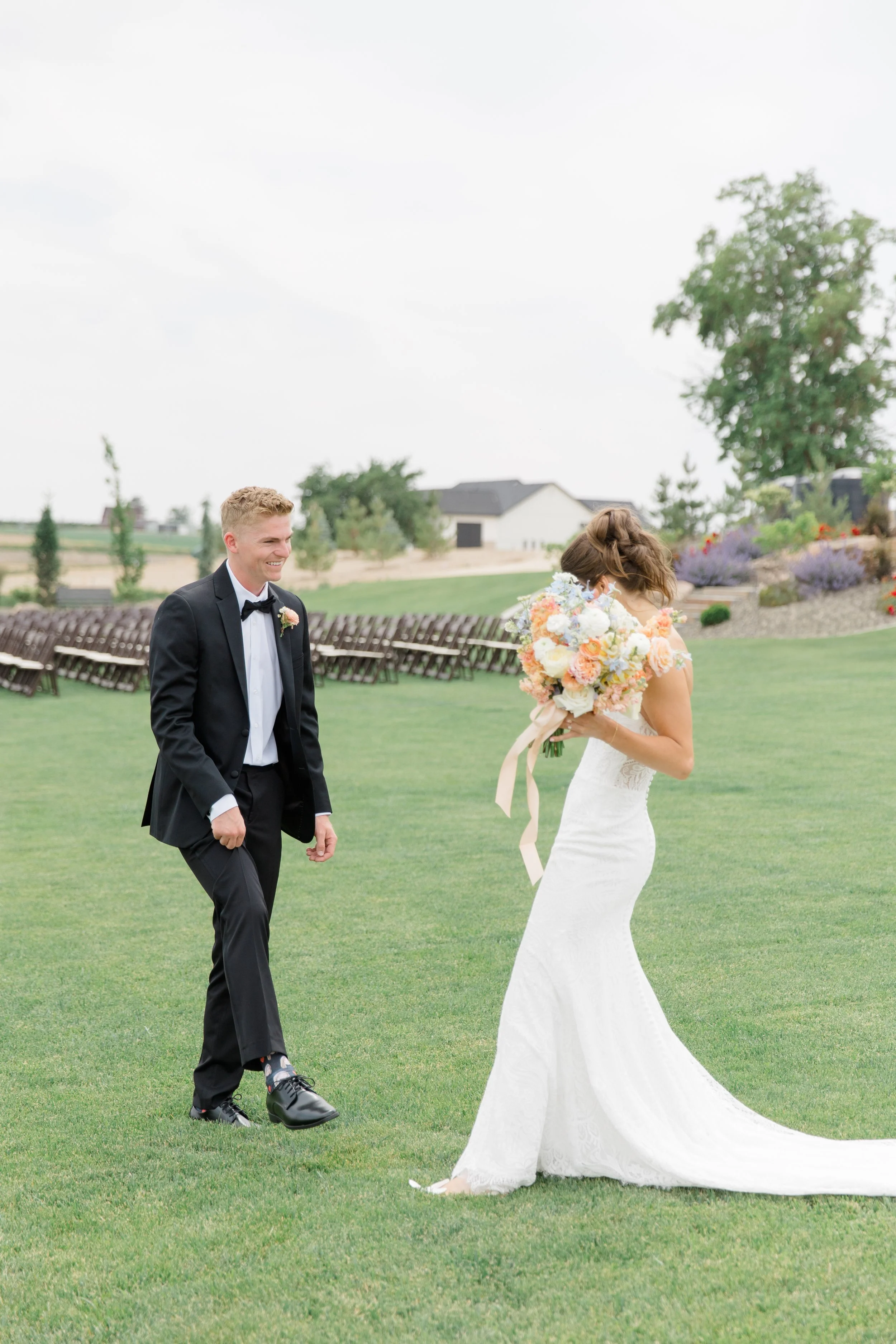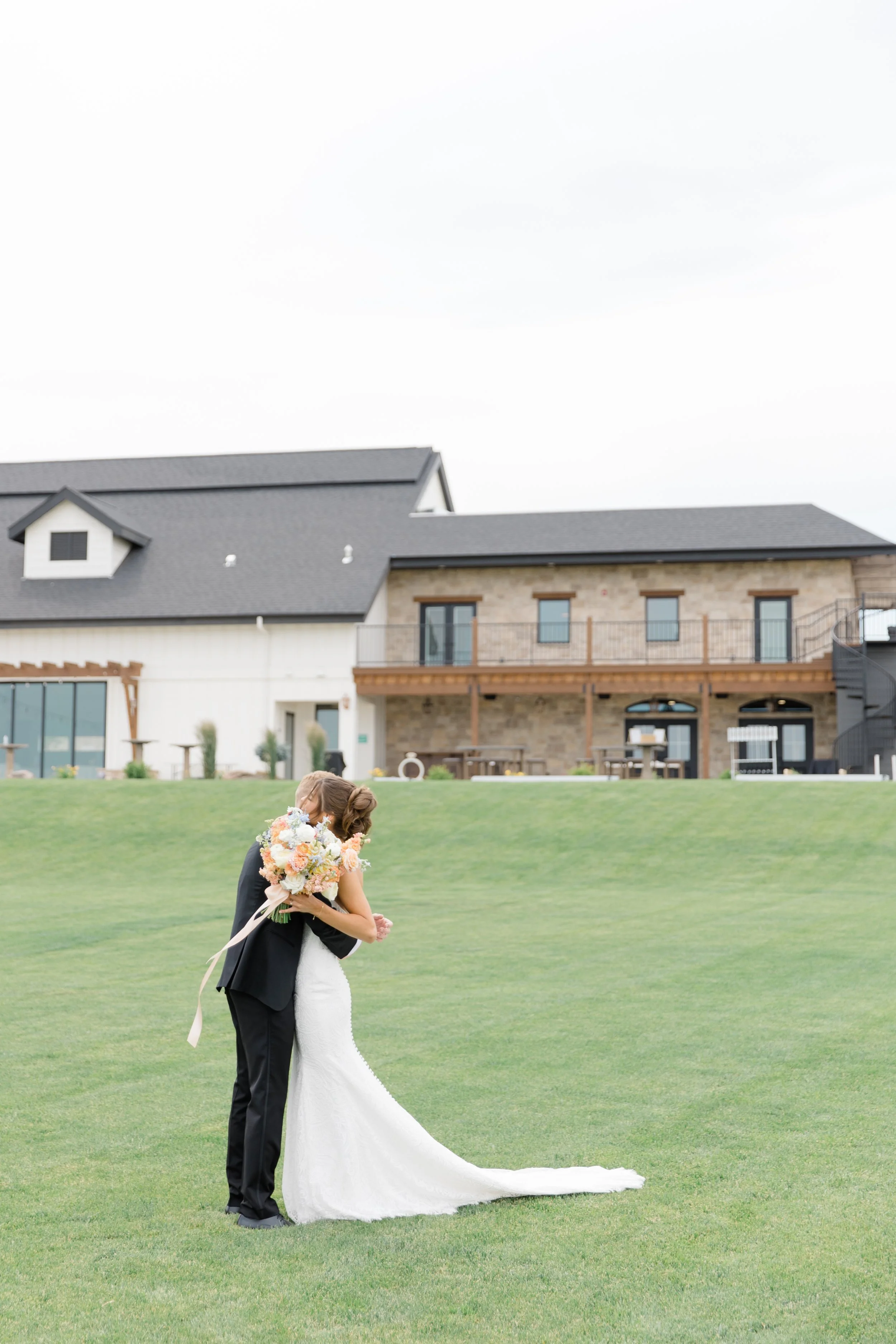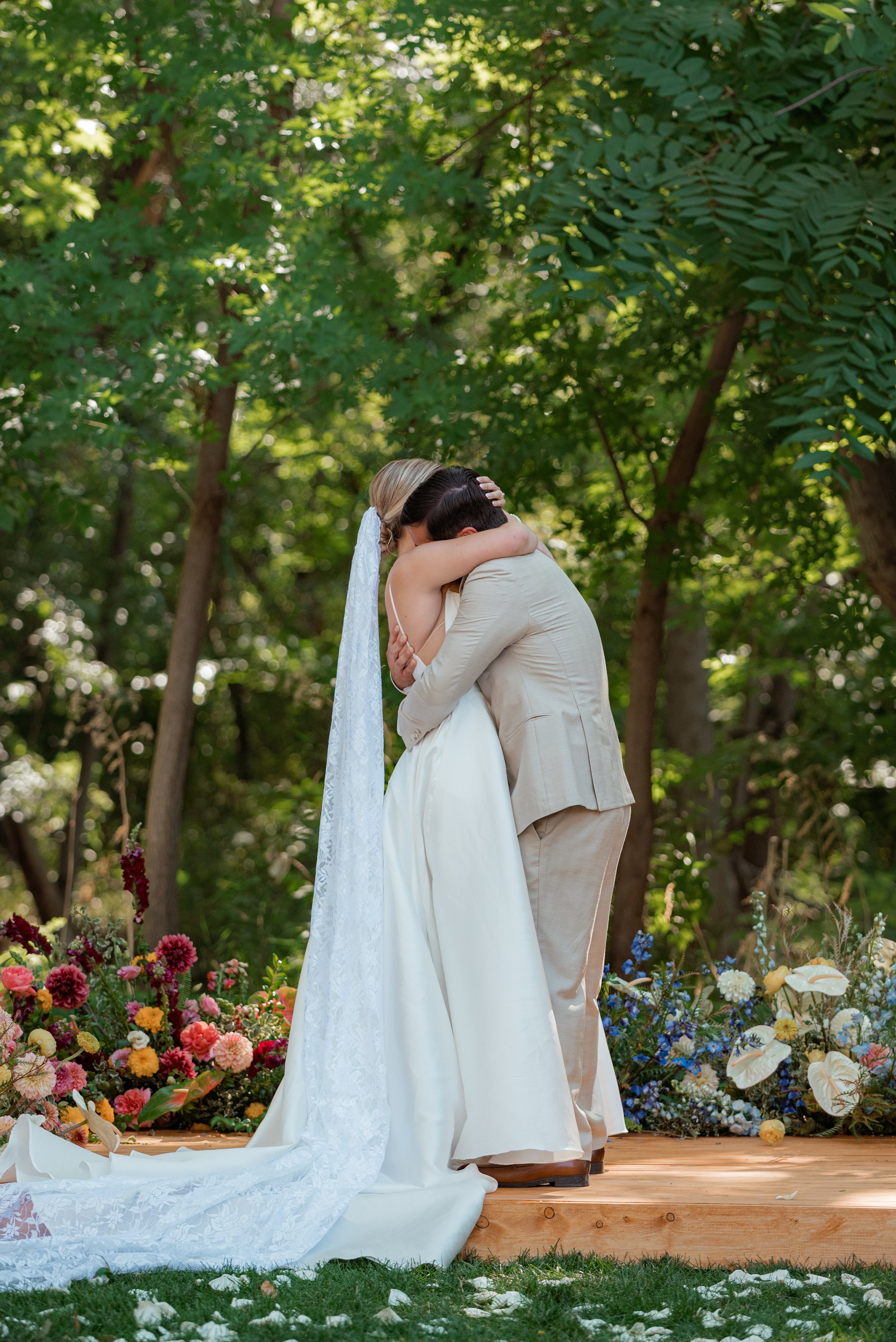 A couple kissing during an outdoor wedding ceremony, surrounded by guests seated on white chairs with floral arrangements on the grass. The groom is wearing a suit, and the bride is in a white dress holding a floral bouquet. The setting is sunny with