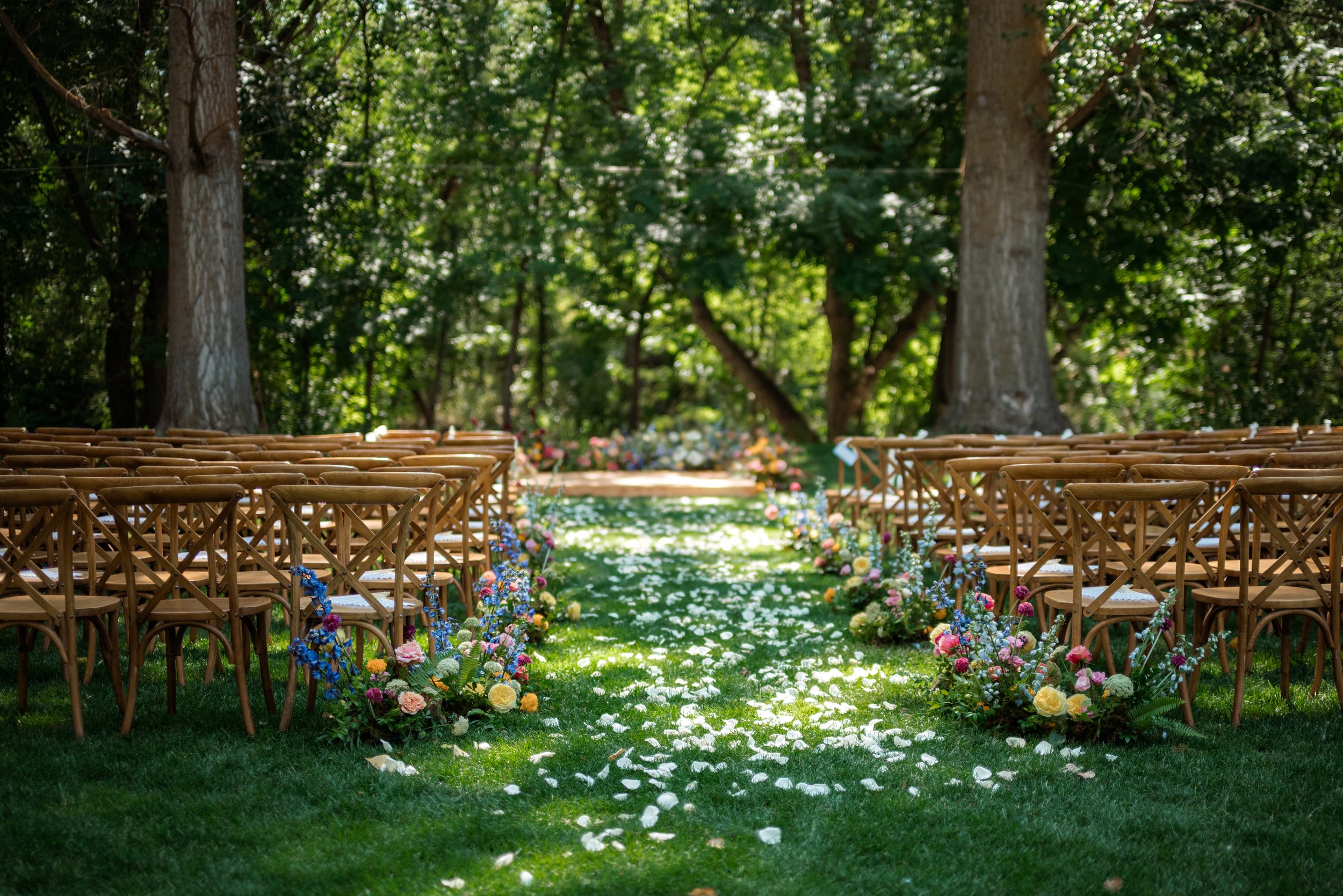 Outdoor wedding ceremony setup with white chairs, floral aisle decorations, and greenery backdrop.