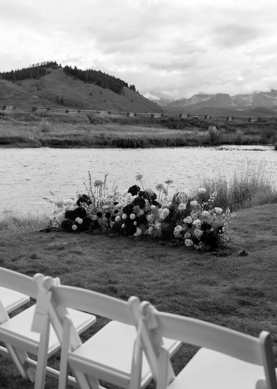 Outdoor wedding ceremony setup with white chairs and floral arrangements on a lawn.