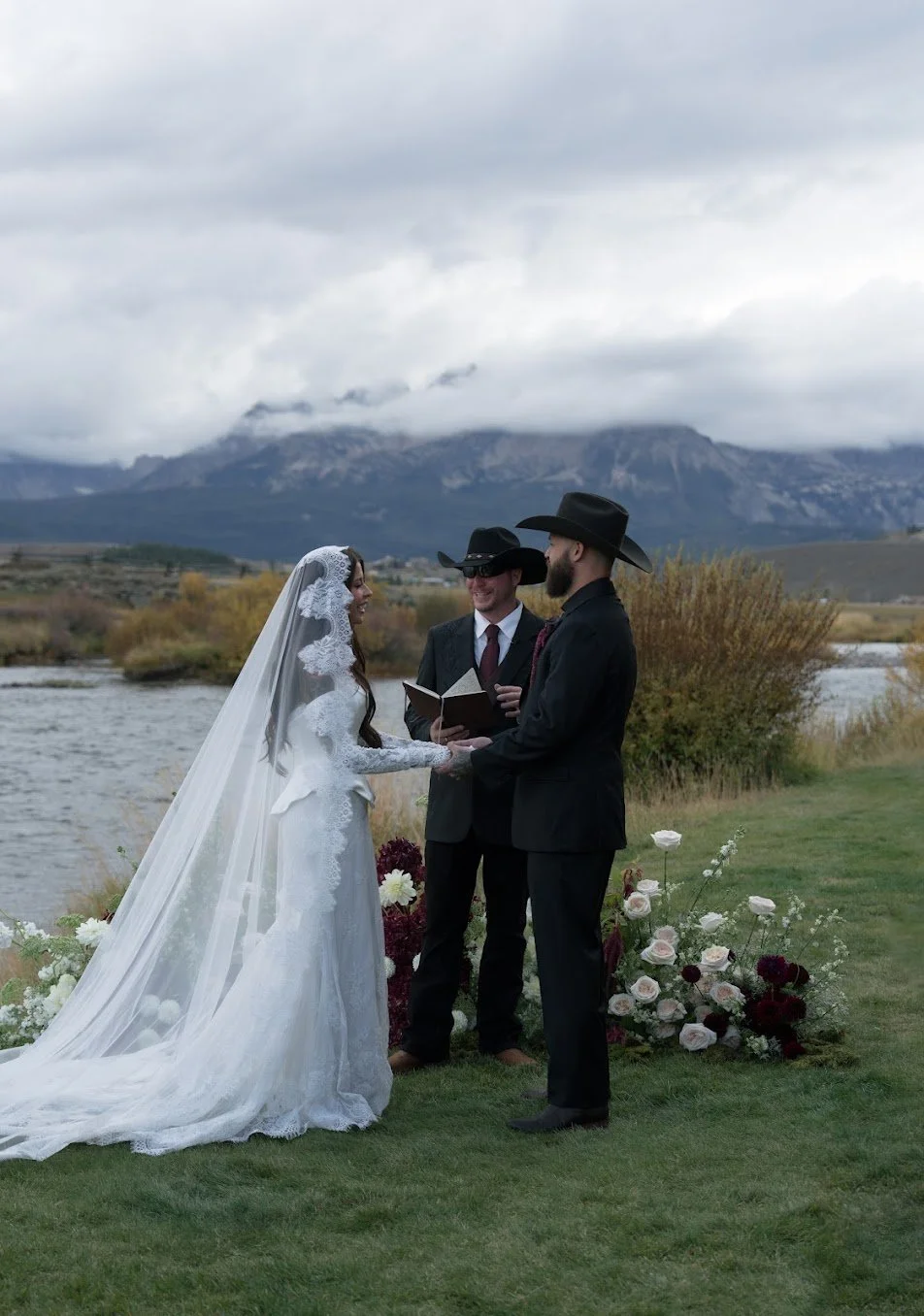 Wedding ceremony outdoors with bride, groom, and officiant standing under wooden hexagonal arch decorated with greenery.