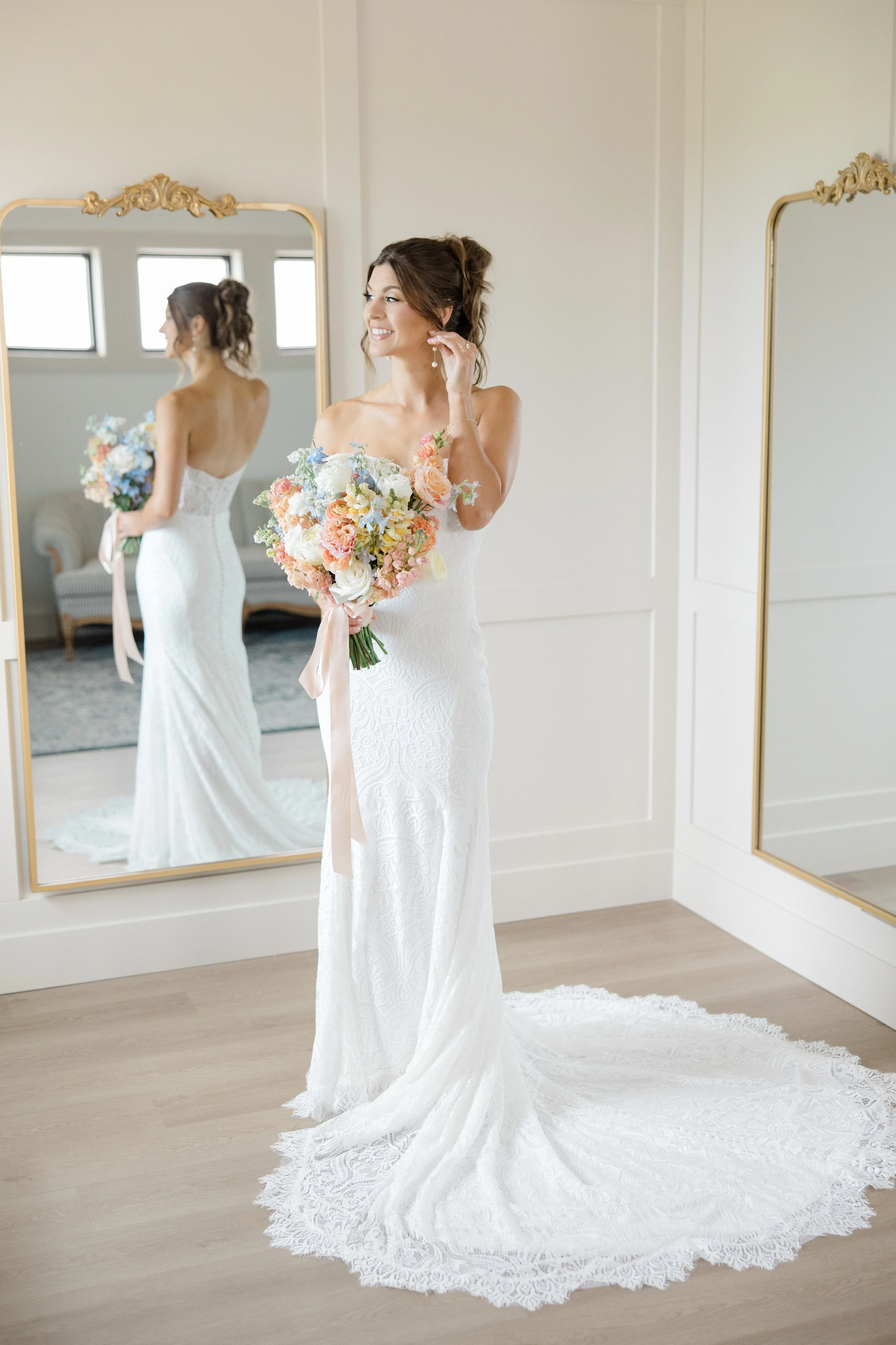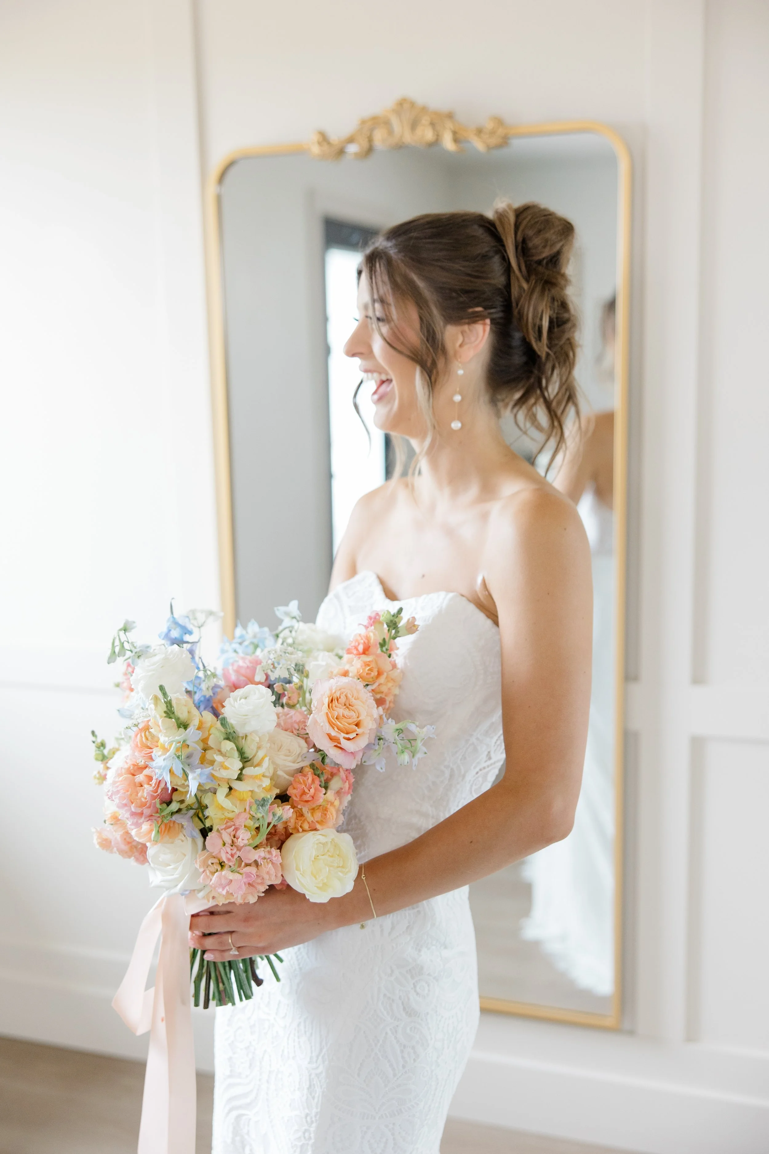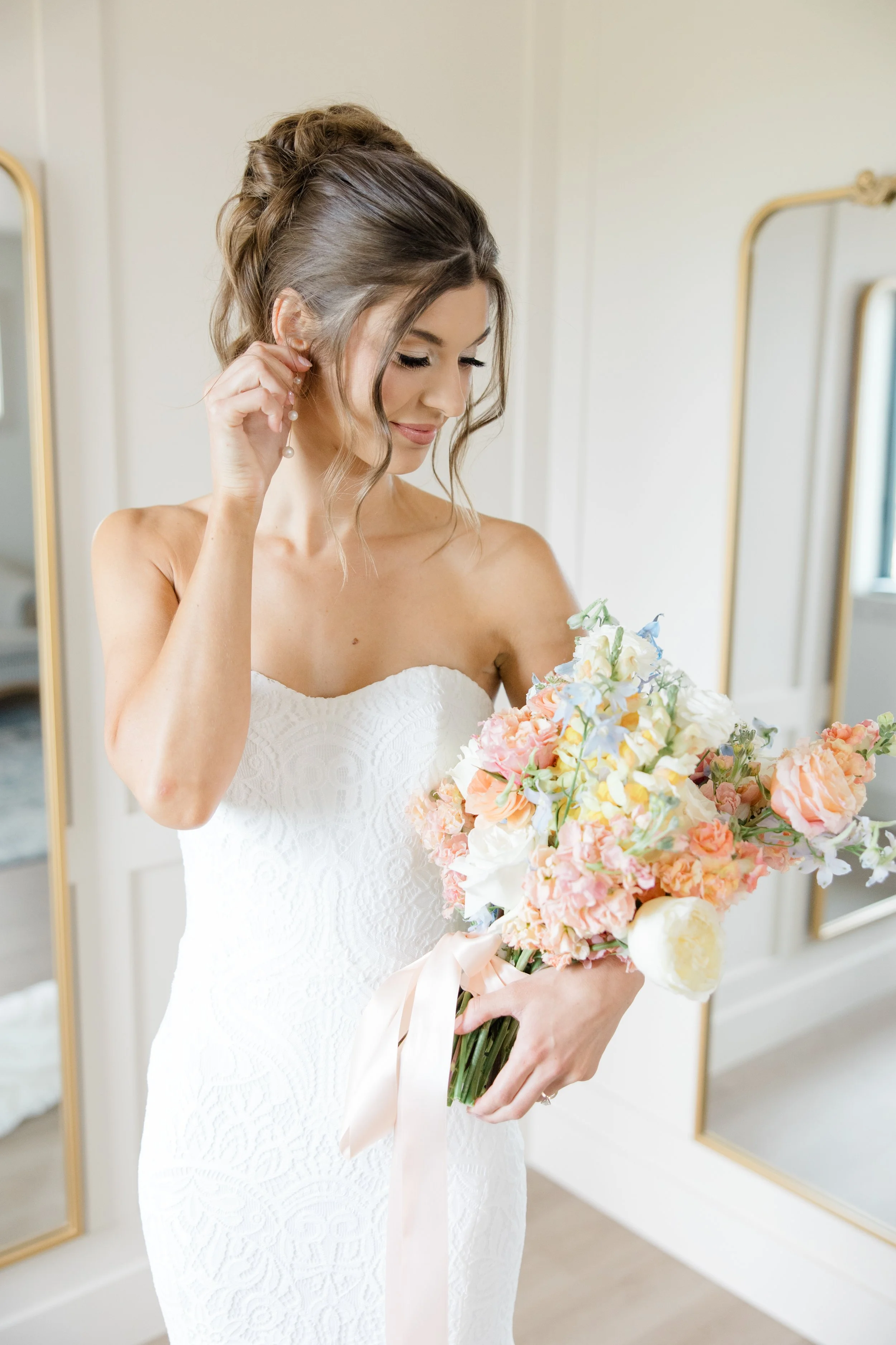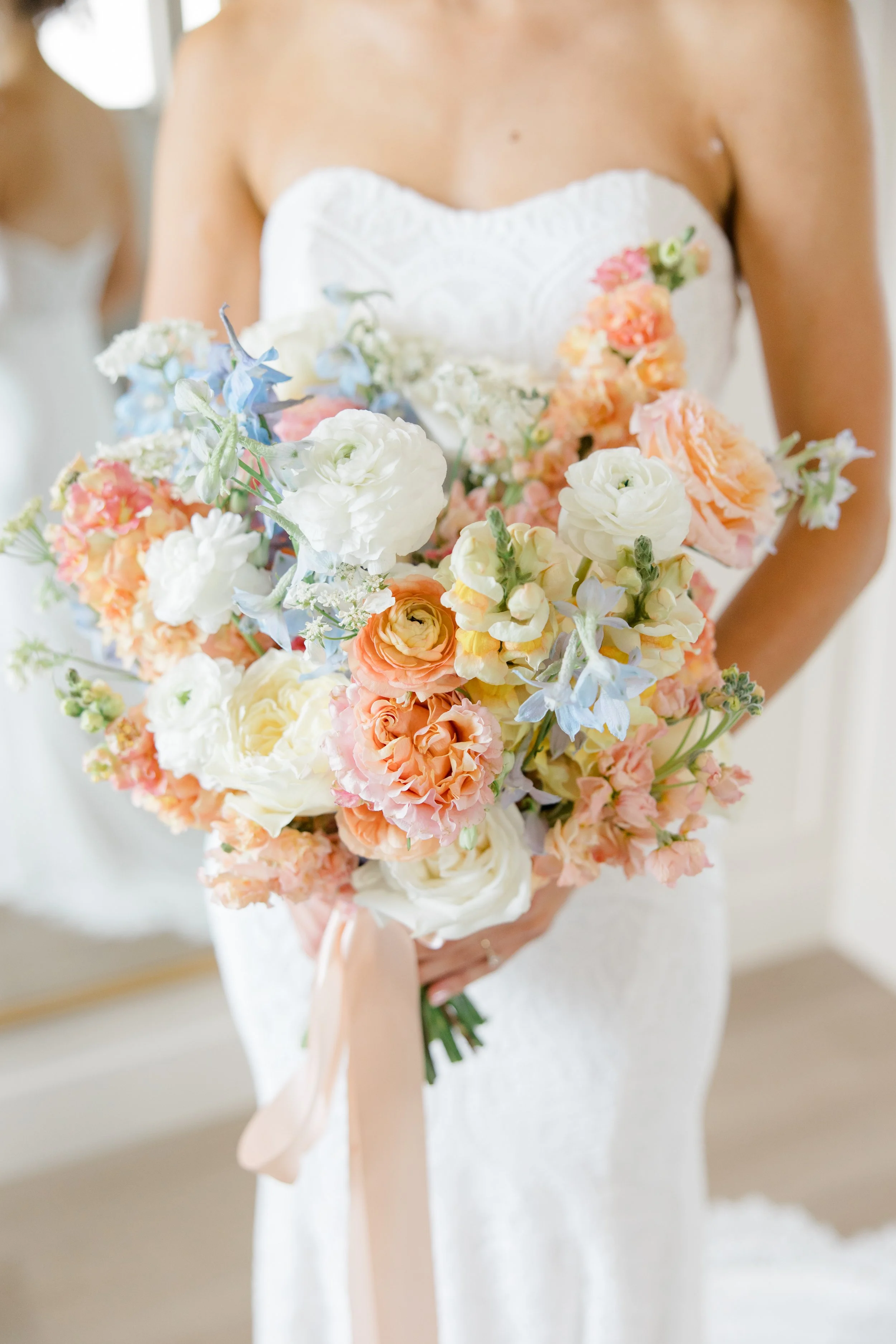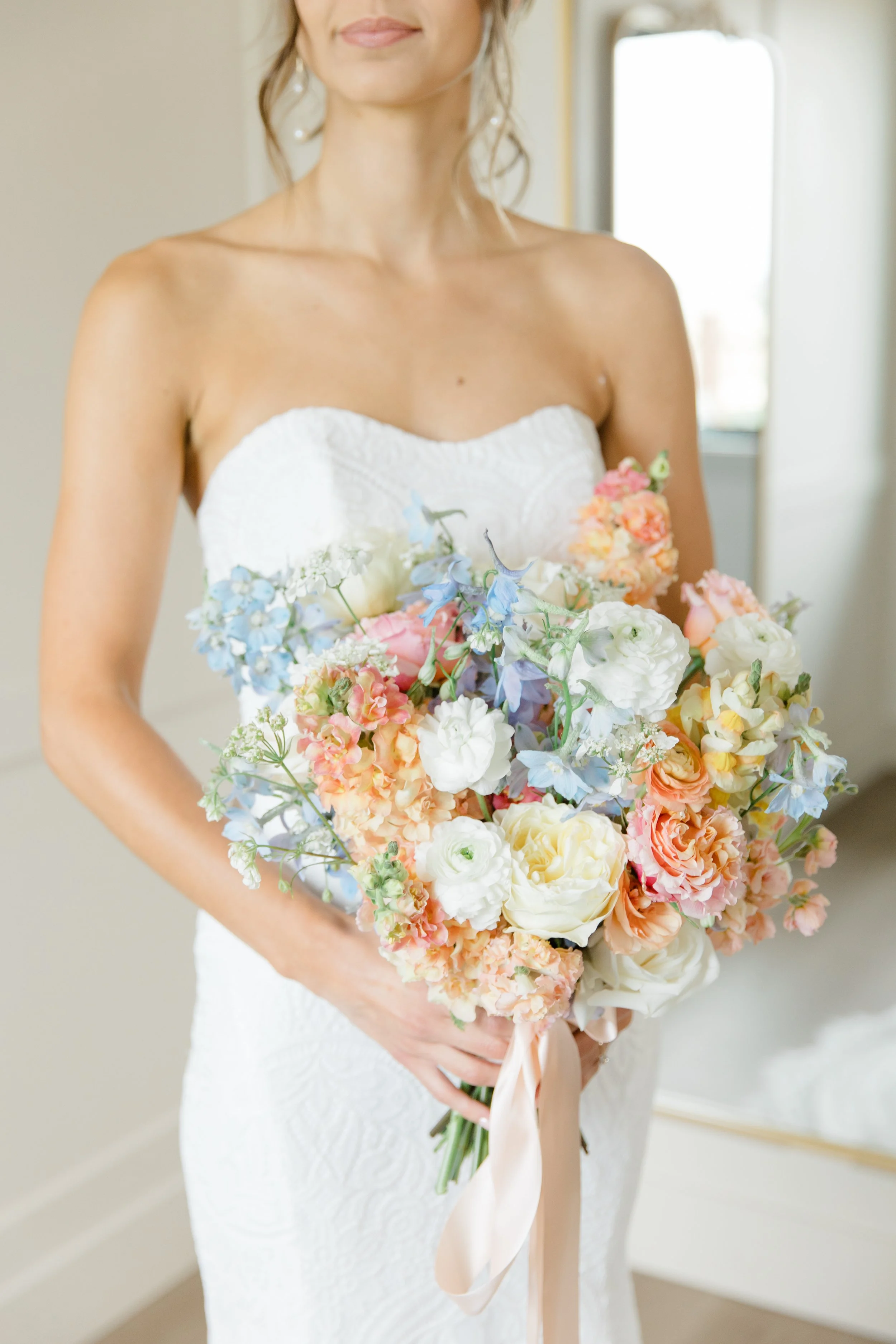 Close-up of woman in a white dress holding a bouquet of white and pastel flowers.