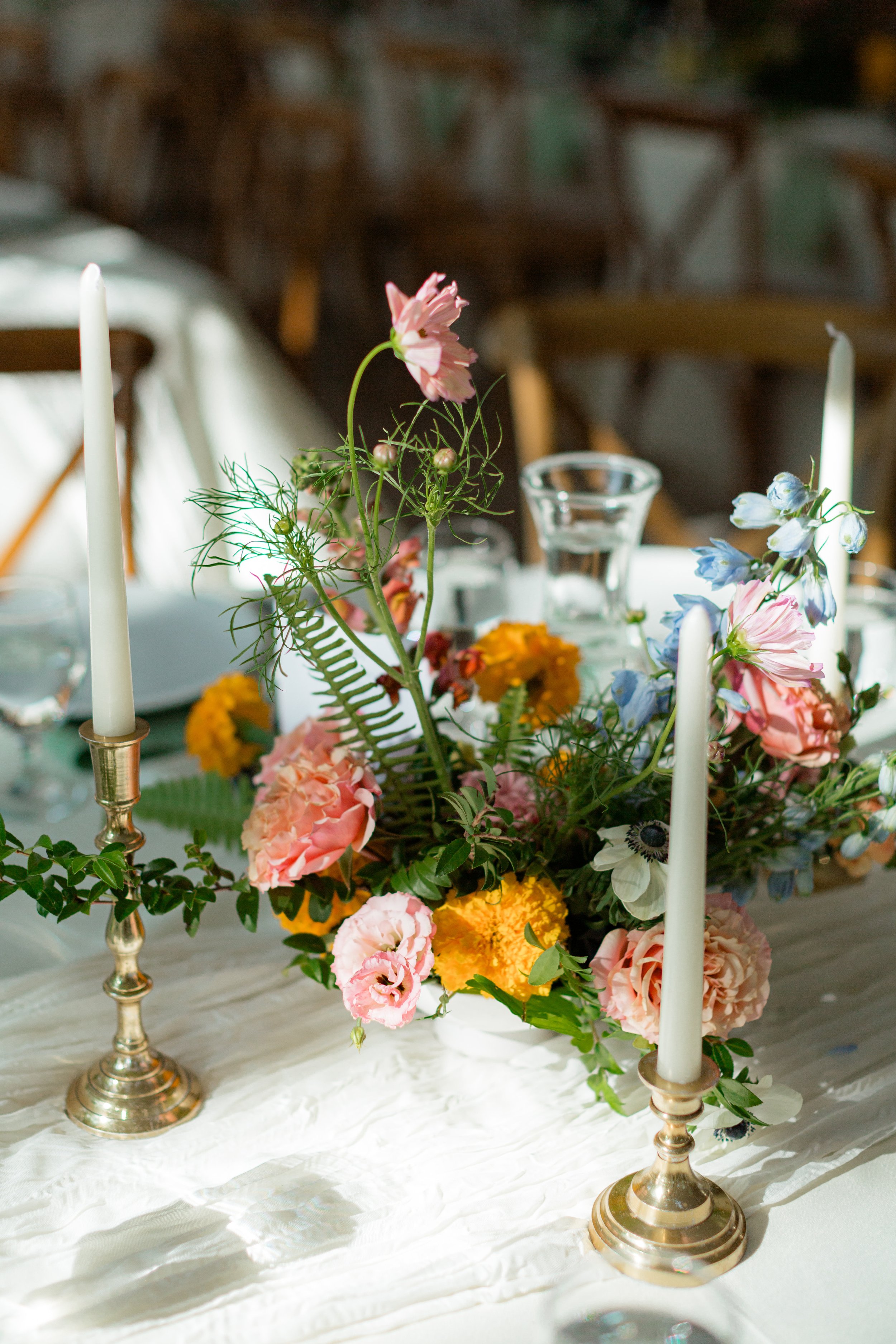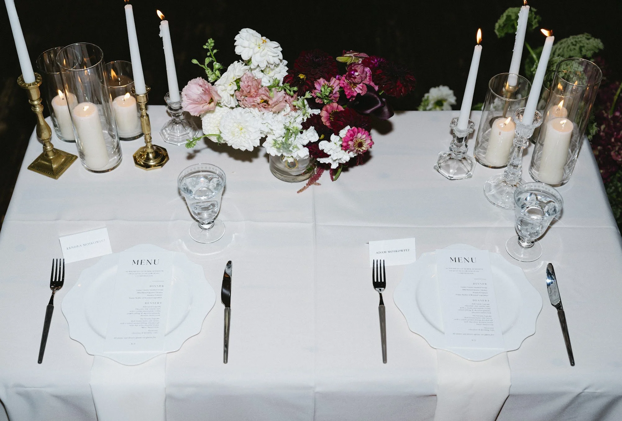 Table setting with floral centerpiece, tall candles, wine glasses, gold number 4, and a small jar of dessert.