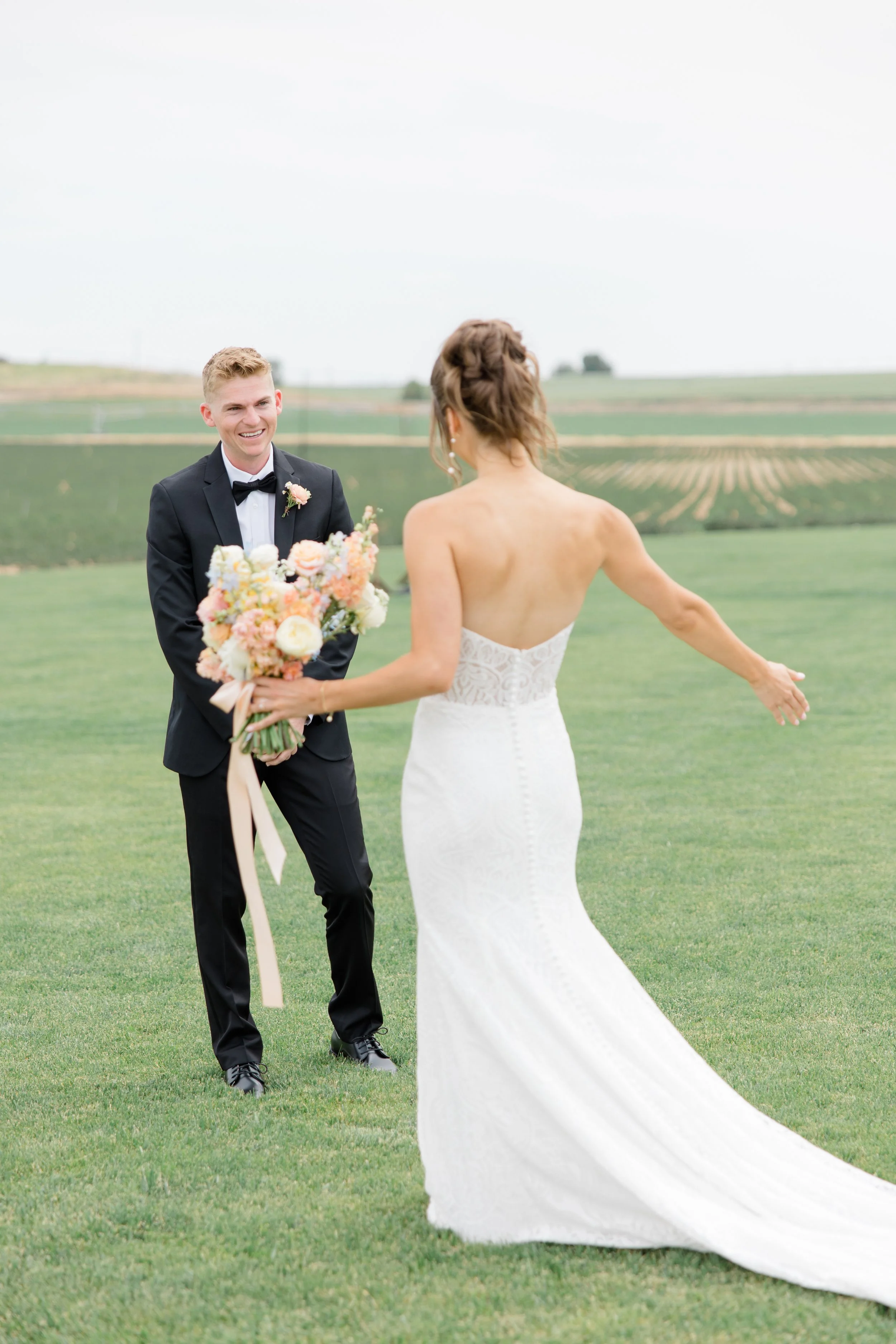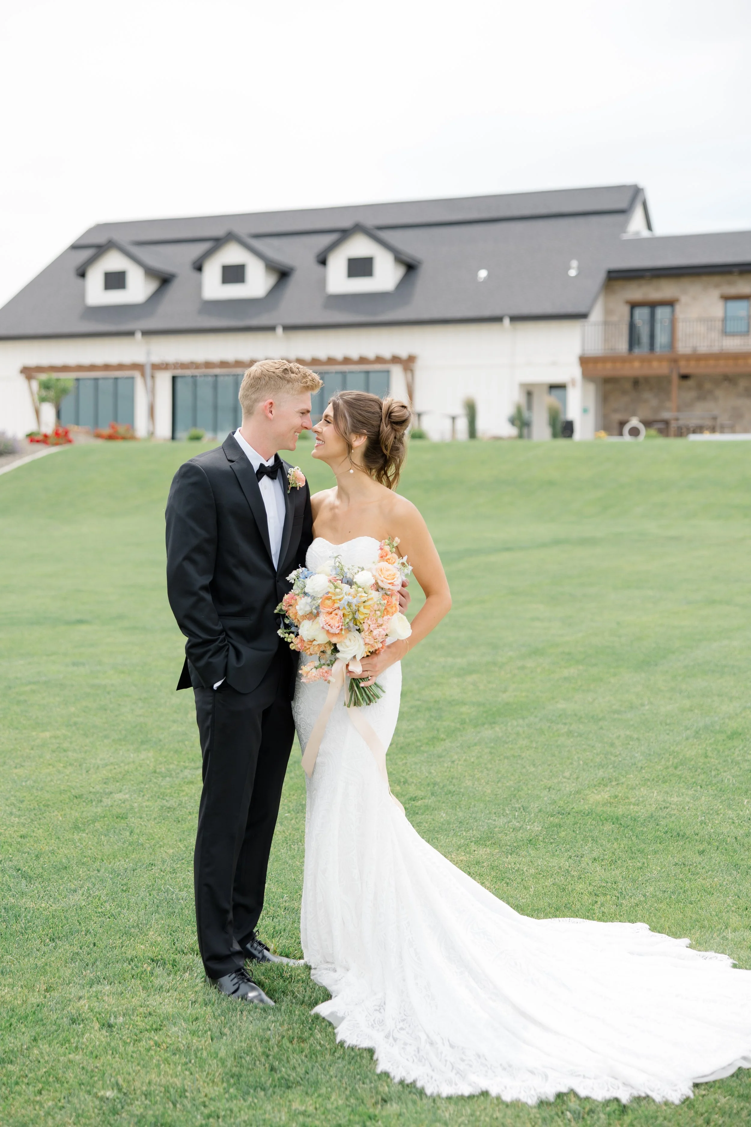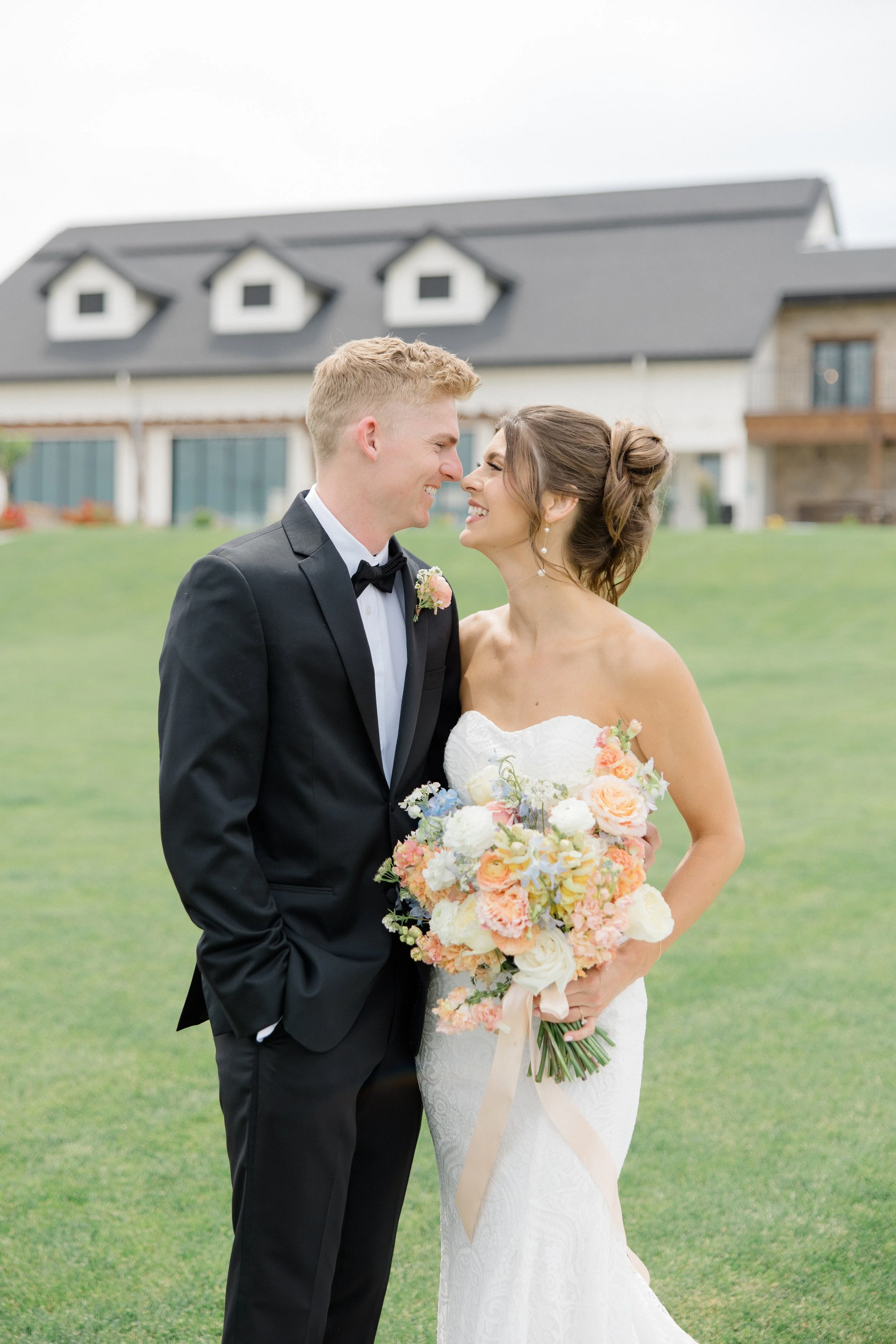 Bride and groom standing together, bride holding bouquet of pink and yellow flowers, wearing a lace wedding dress, groom in a beige suit.