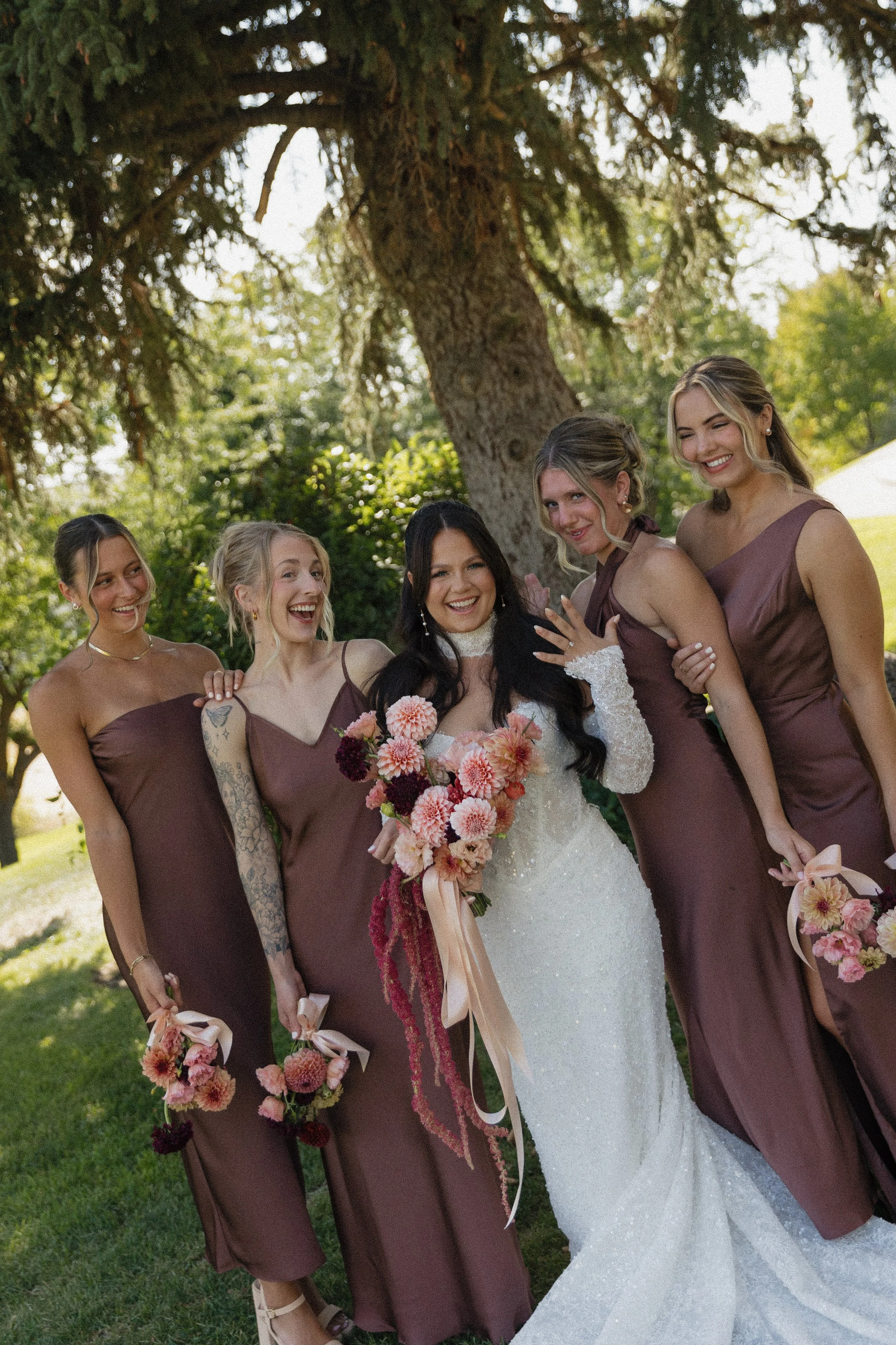 A wedding party poses outdoors in front of a house, with trees providing shade. The group includes three men in gray suits and two women in dresses, one in white holding a bouquet, presumably the bride, and another in light green also holding flowers