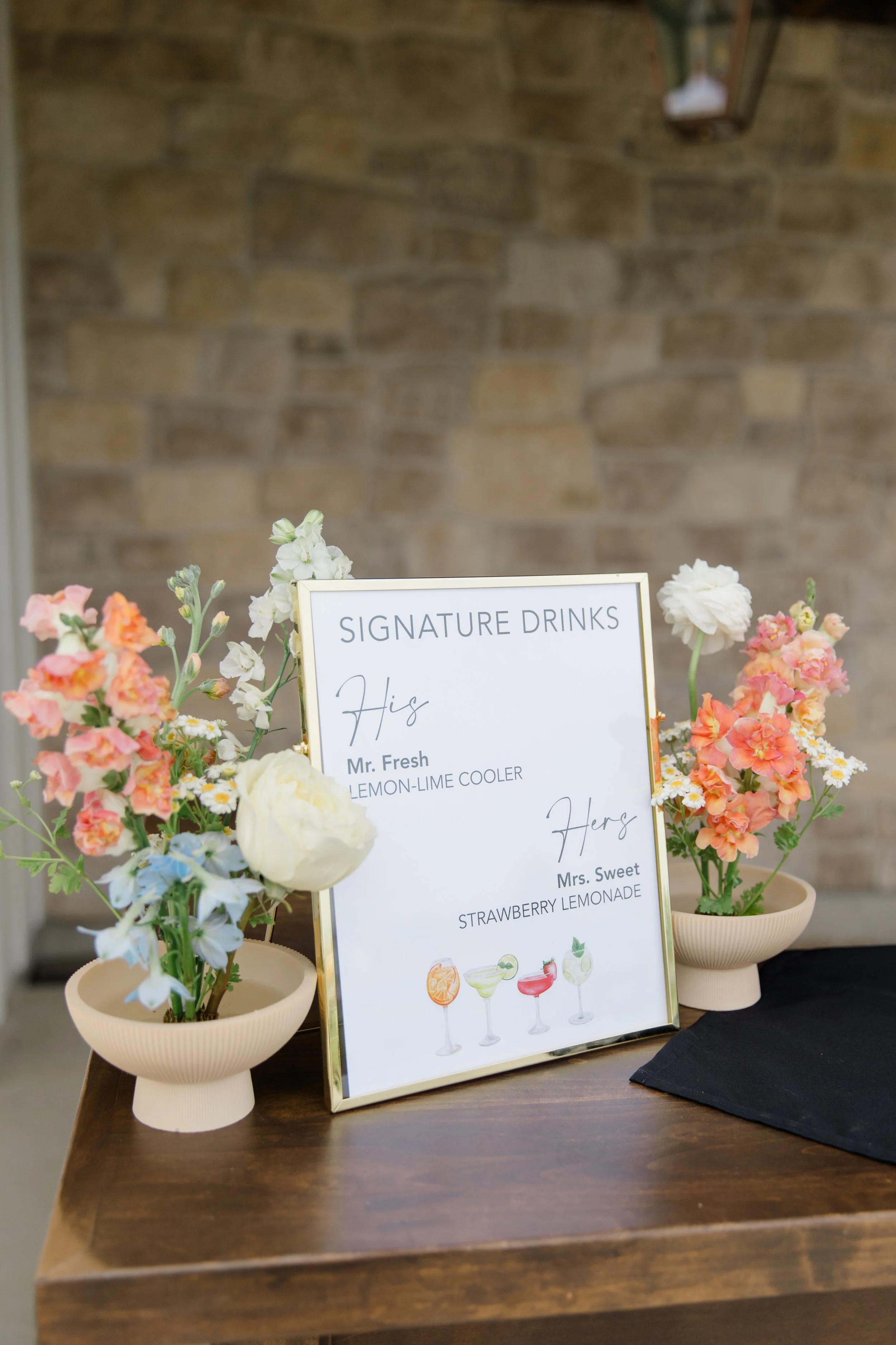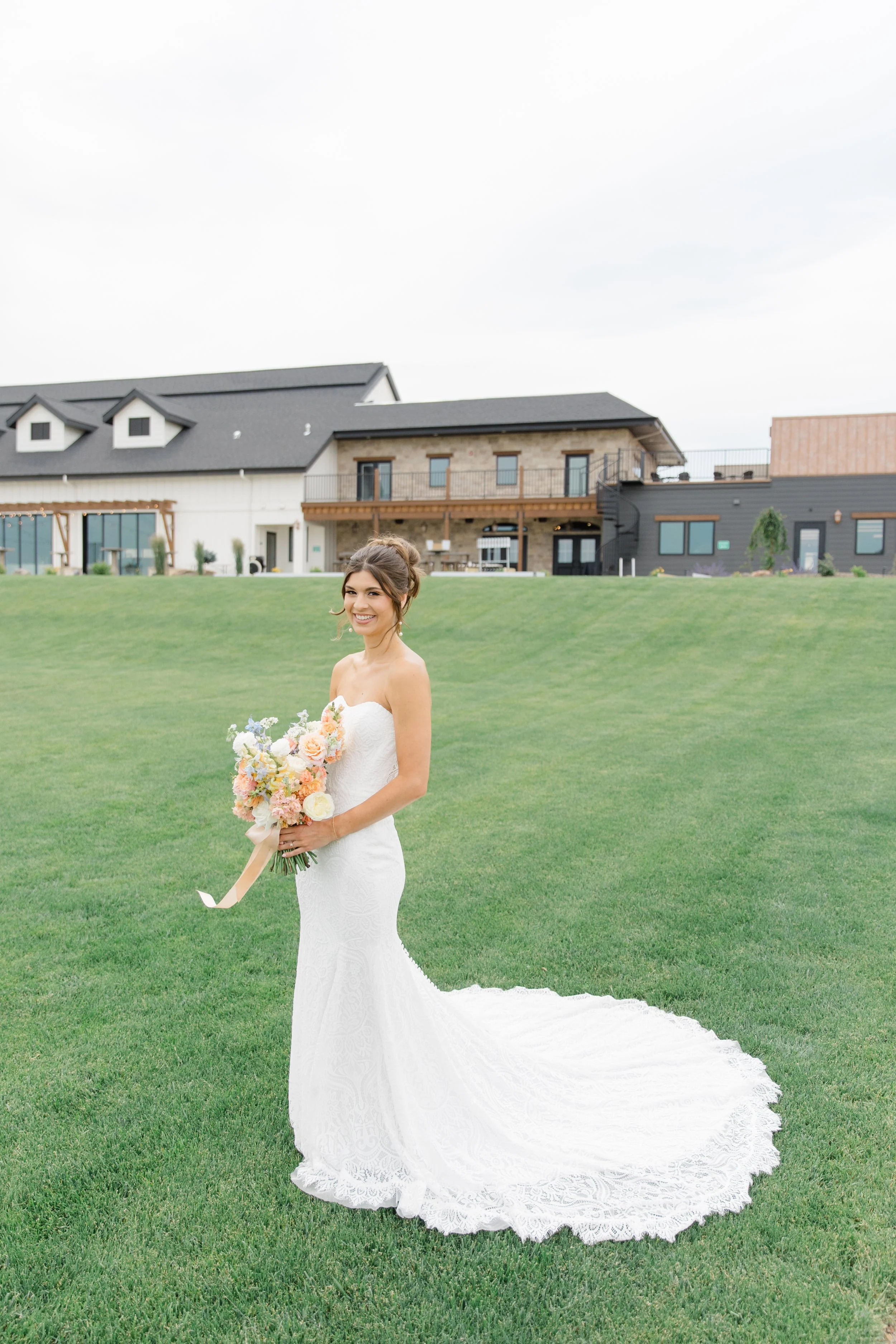 Bride in a white wedding dress holding a bouquet of colorful flowers and a drink, smiling at an outdoor reception with guests in the background.