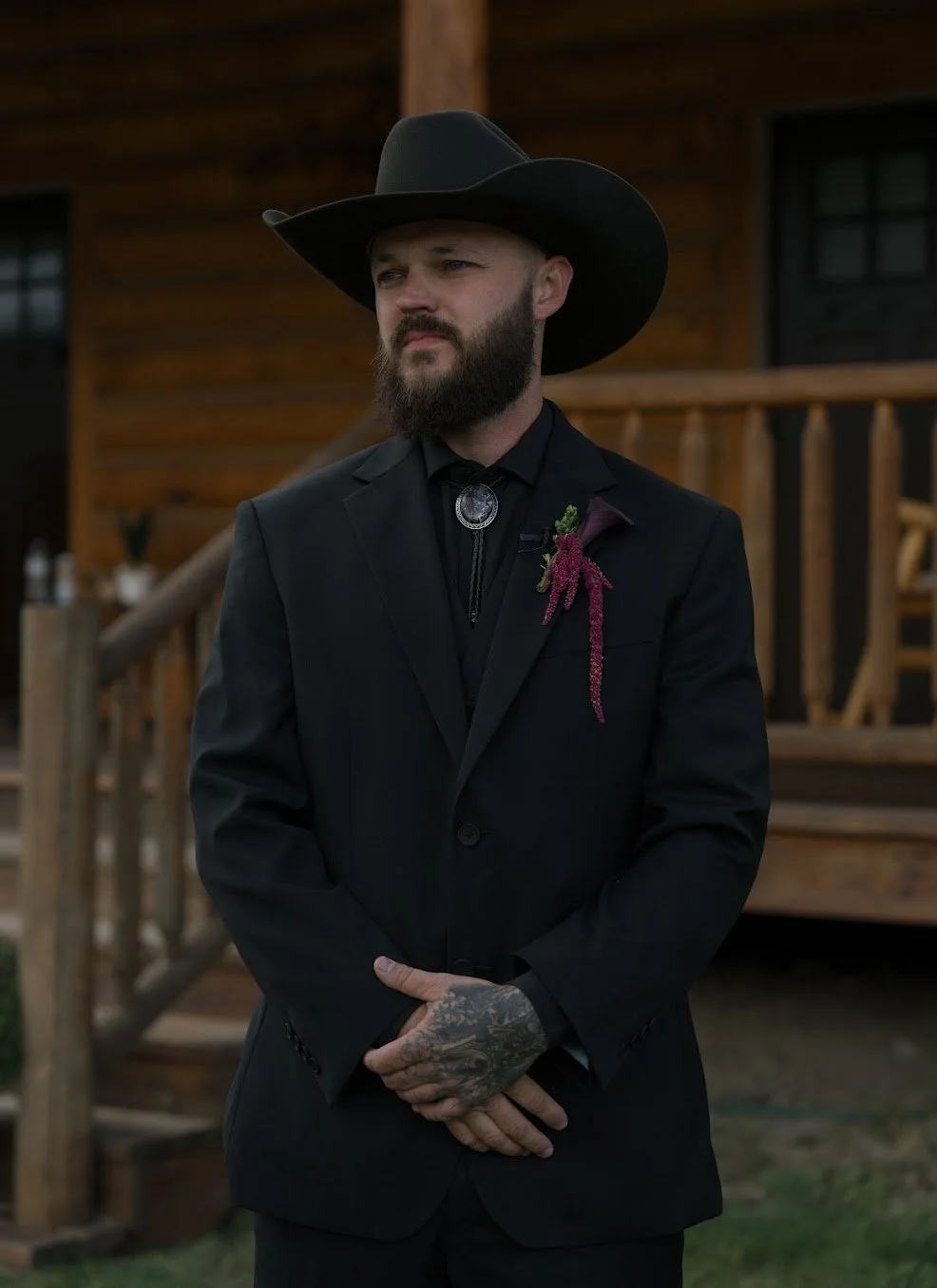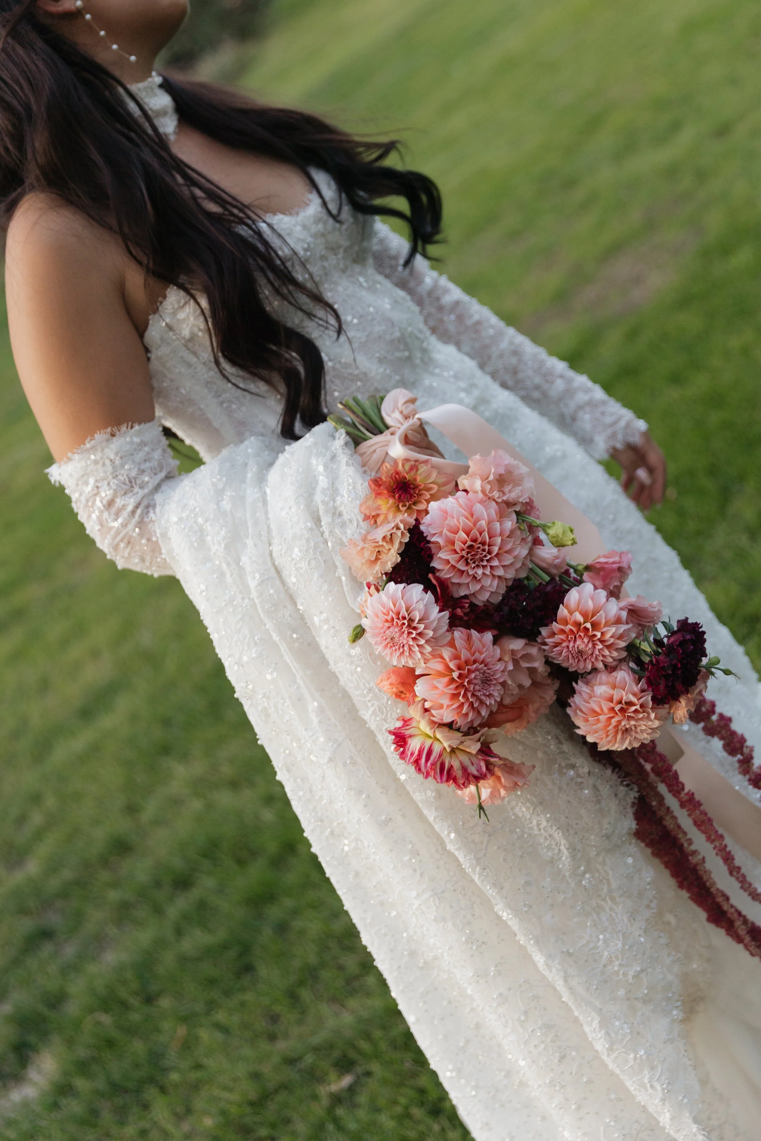 Bride in white dress holding a bouquet of red flowers and wearing a bracelet, with tattoo on thigh.