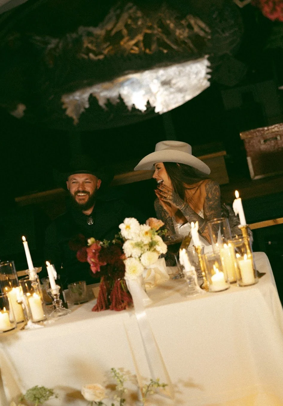 Bride and groom embracing at a wedding with a decorated table and floral arrangements, indoors.