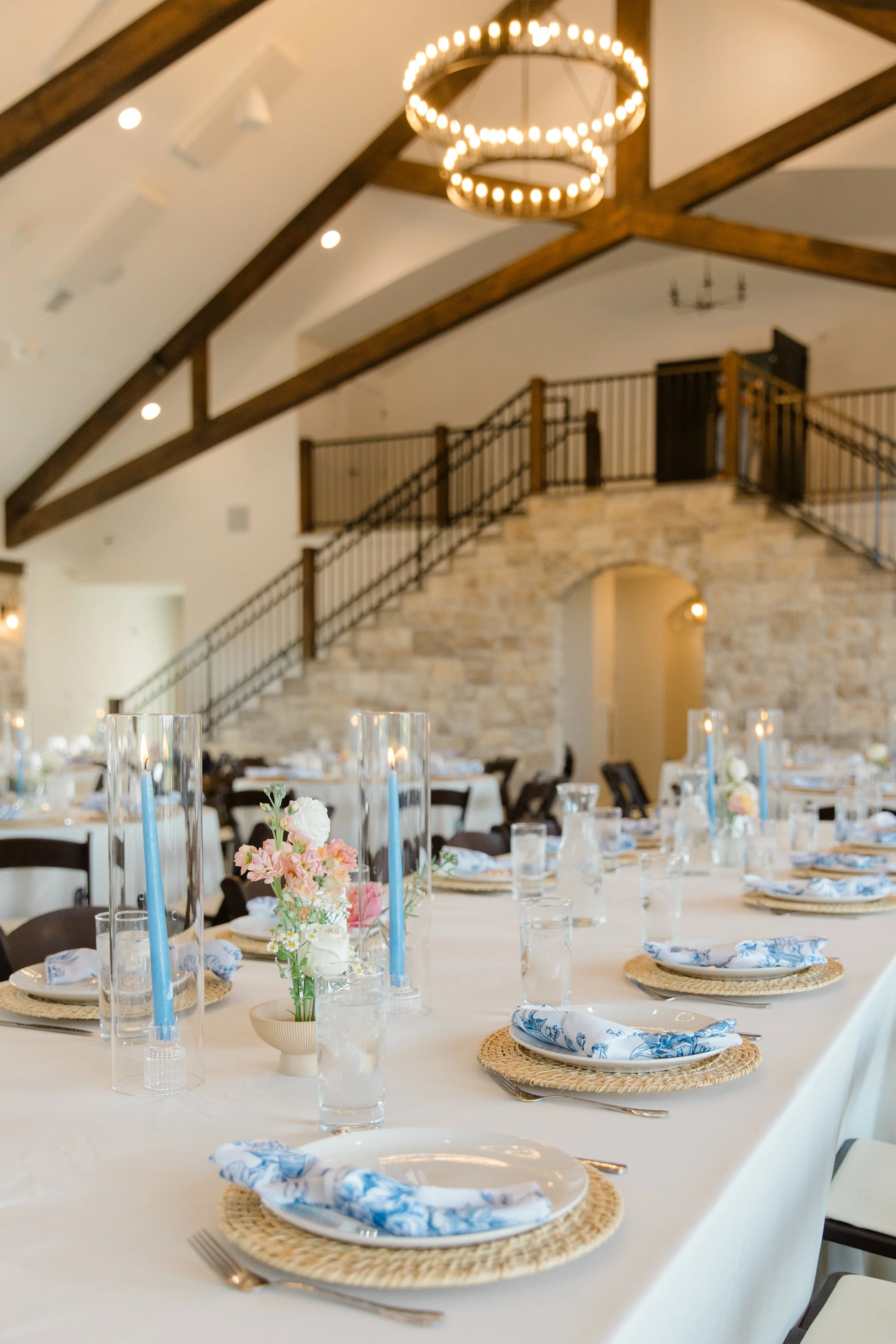 Elegant table setting with floral centerpiece, featuring peach and pink flowers, blue and white patterned plates, pink napkins, and glassware on a wooden table.