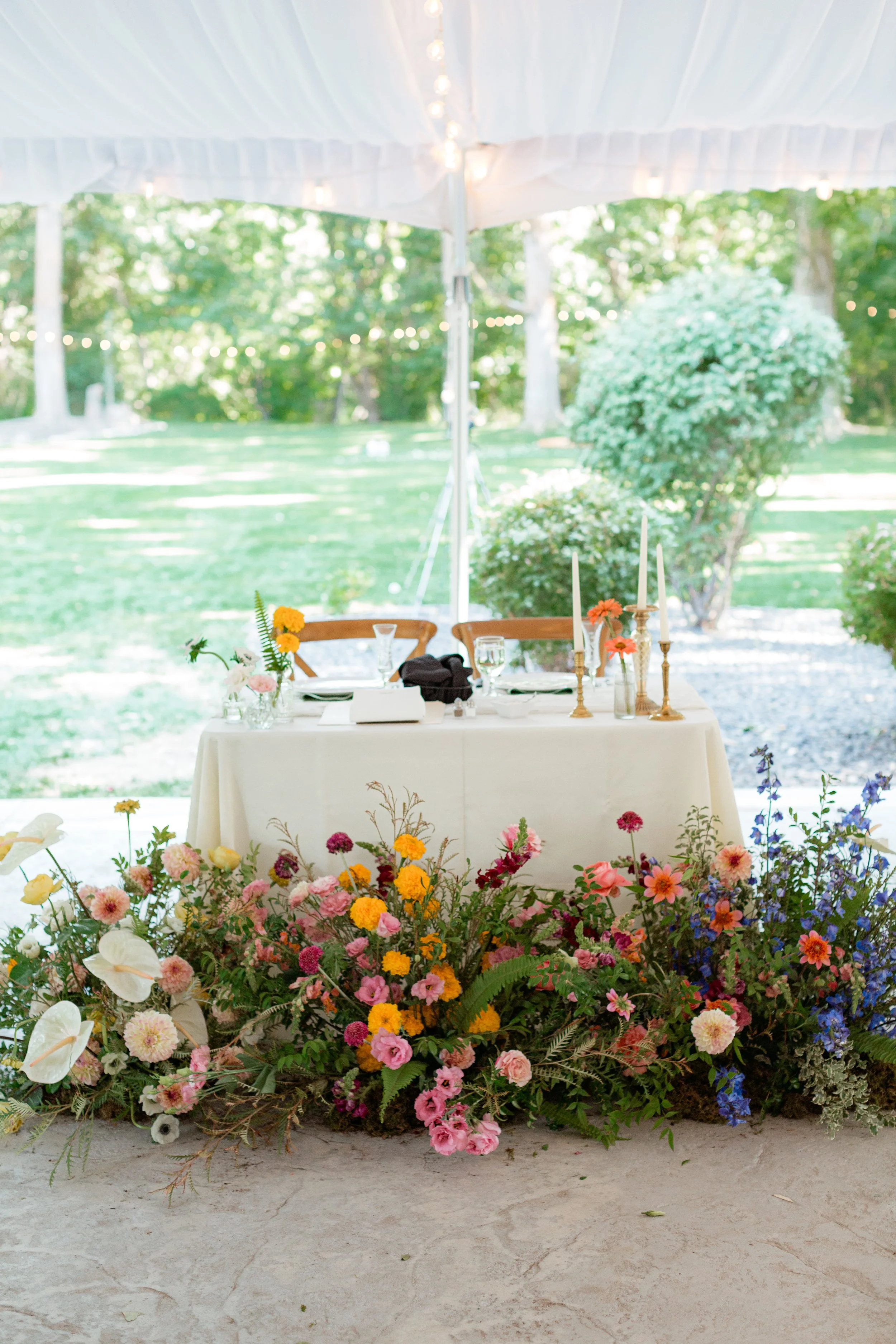 Elegant banquet table setup with candles, plates, napkins, and floral centerpieces under a tent canopy.