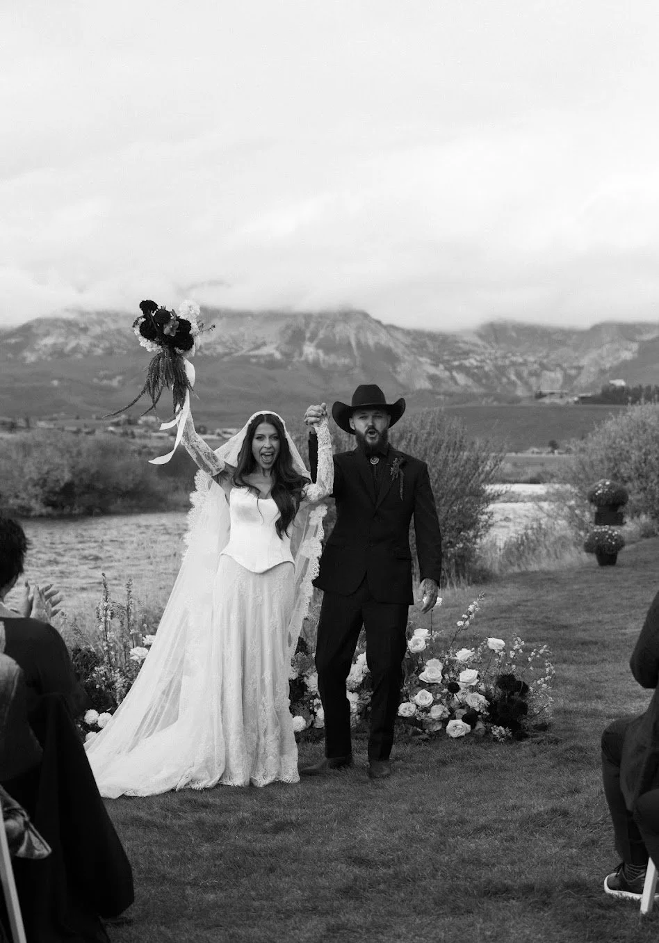 Bride and groom walking down the aisle outdoors, surrounded by guests and trees.