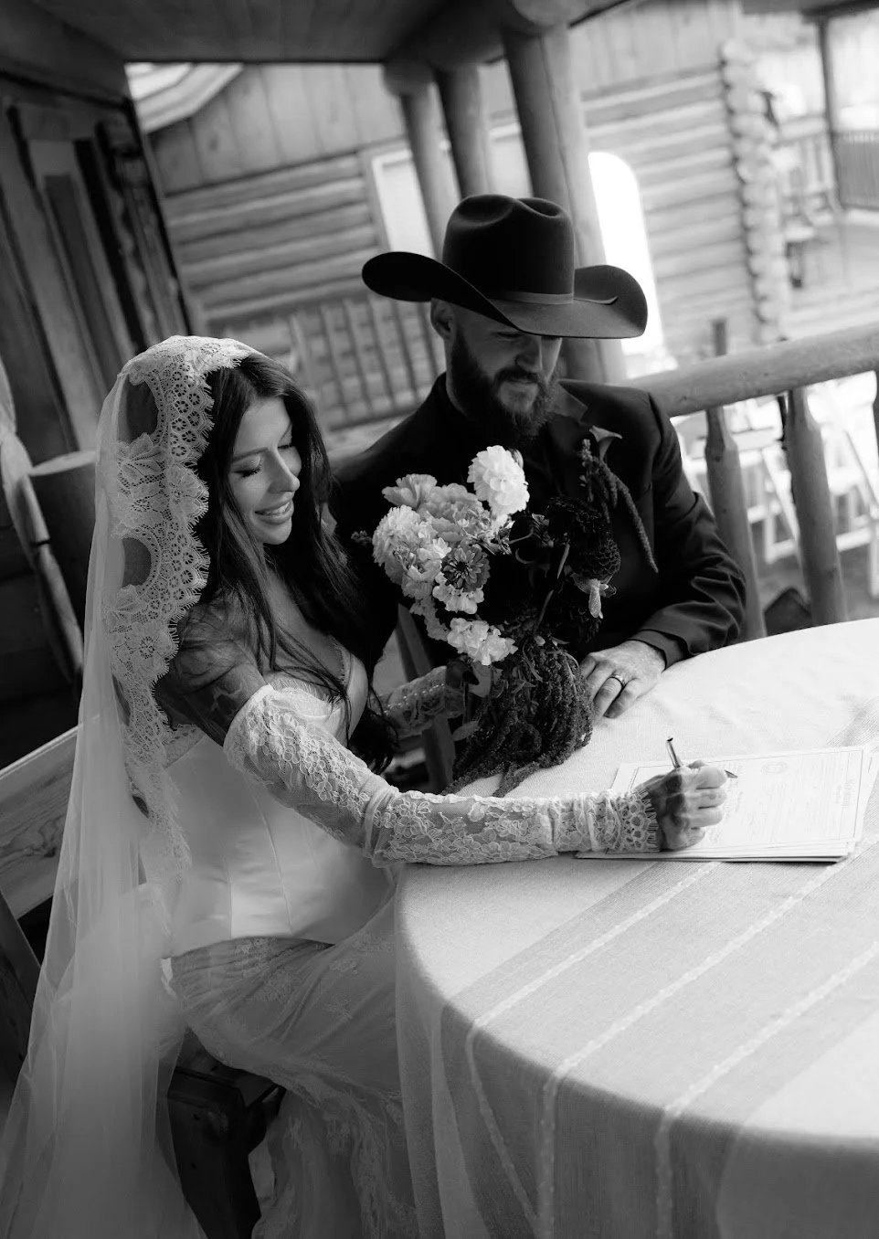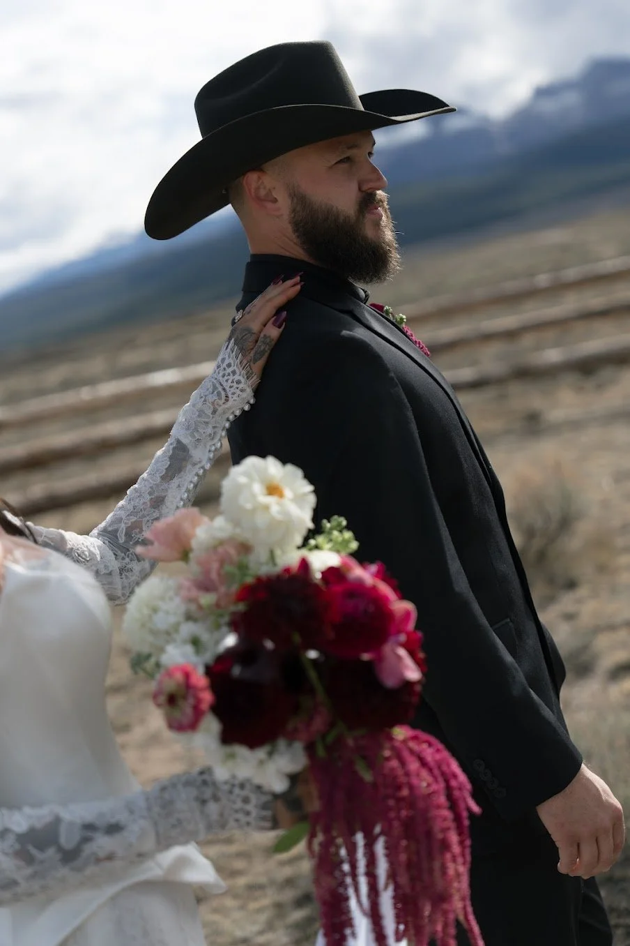 A bride and groom stand together outdoors, with the bride holding a bouquet of colorful flowers. The bride is wearing a white dress with lace sleeves and has her hair styled in an updo. The groom is wearing a suit with a boutonniere. They appear to b