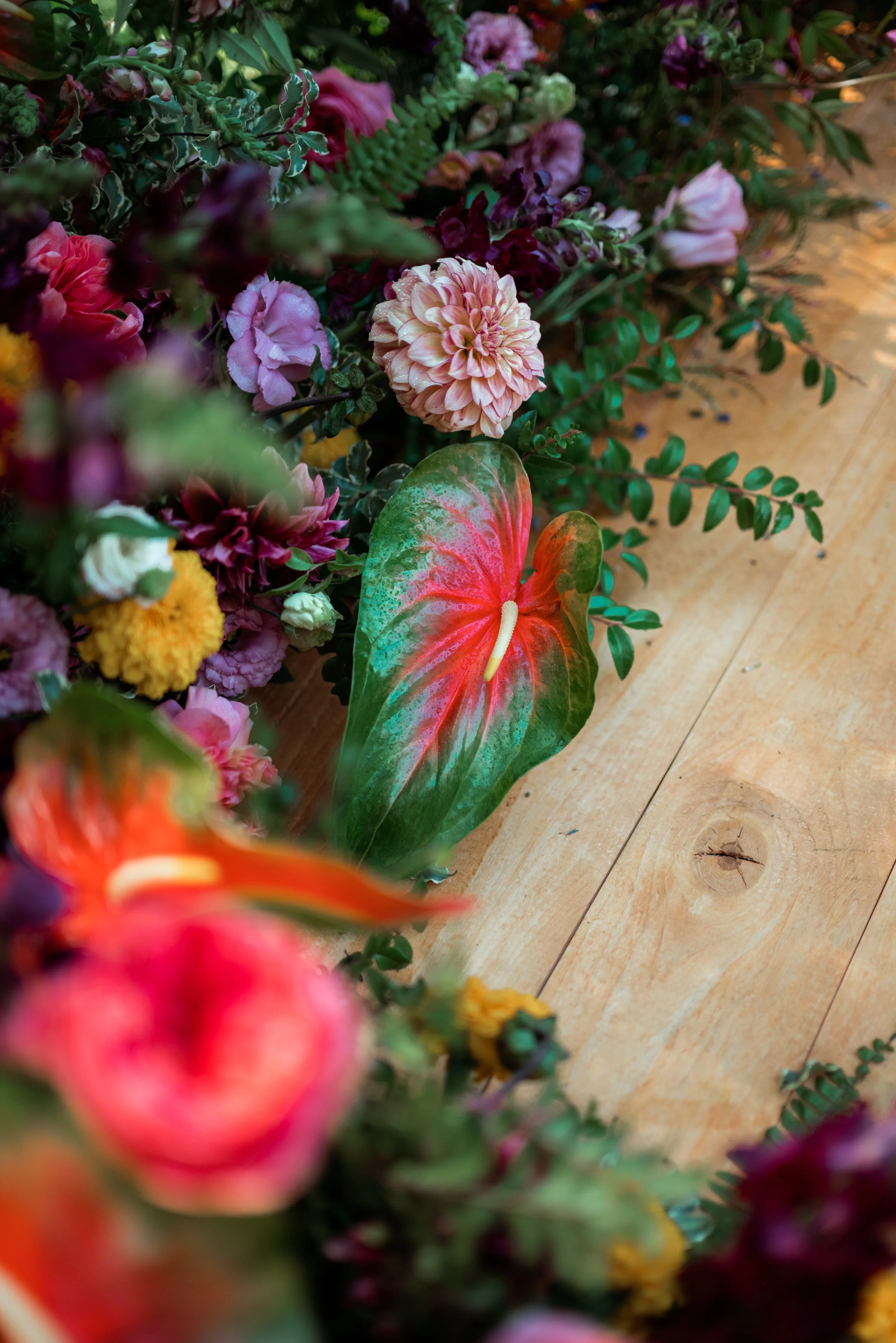 Bride and groom standing by a large floral arrangement with red roses and greenery, next to an overturned chandelier and red velvet fabric.
