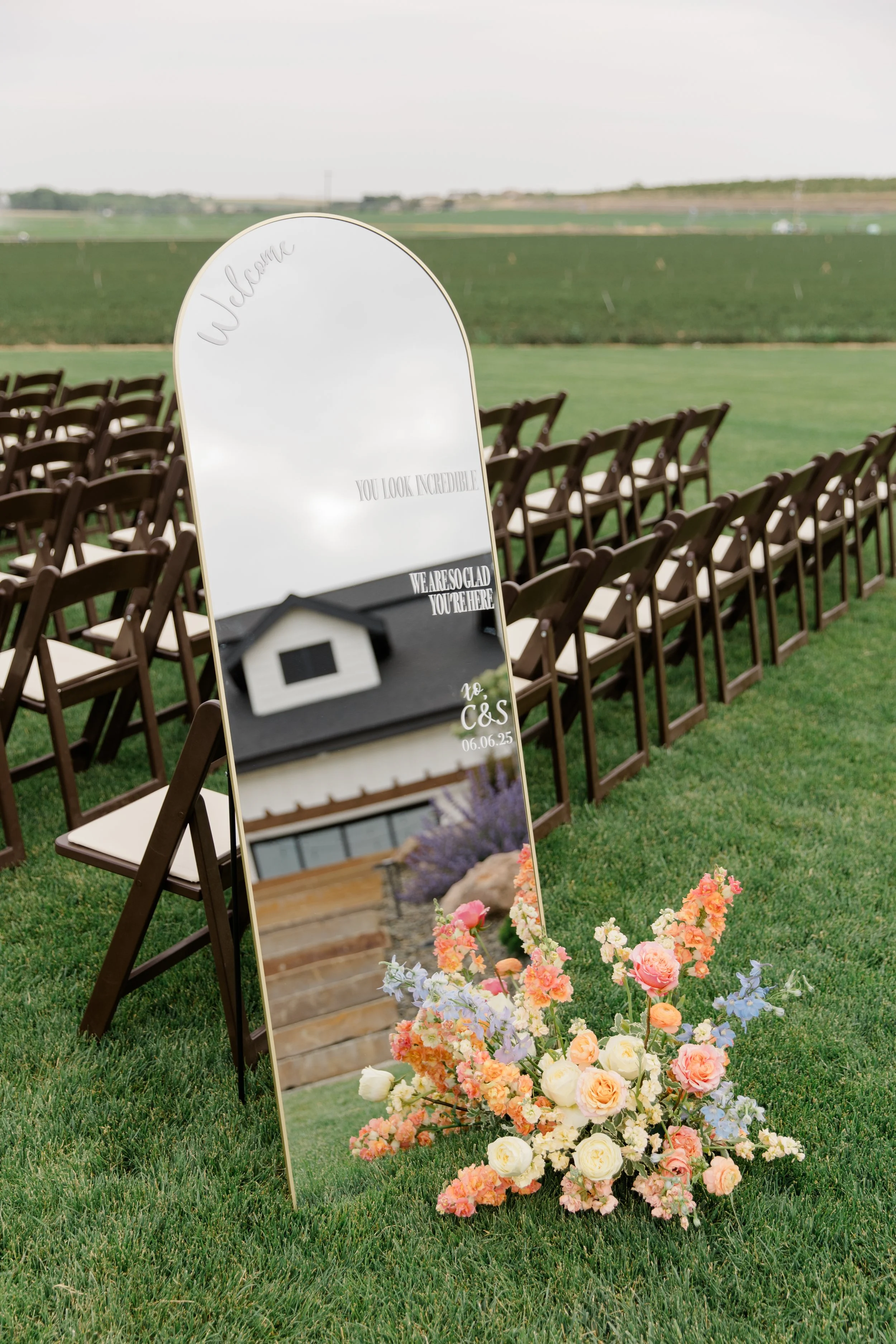 Floral arrangement with pink and white flowers leaning against a large mirror on a grassy surface.