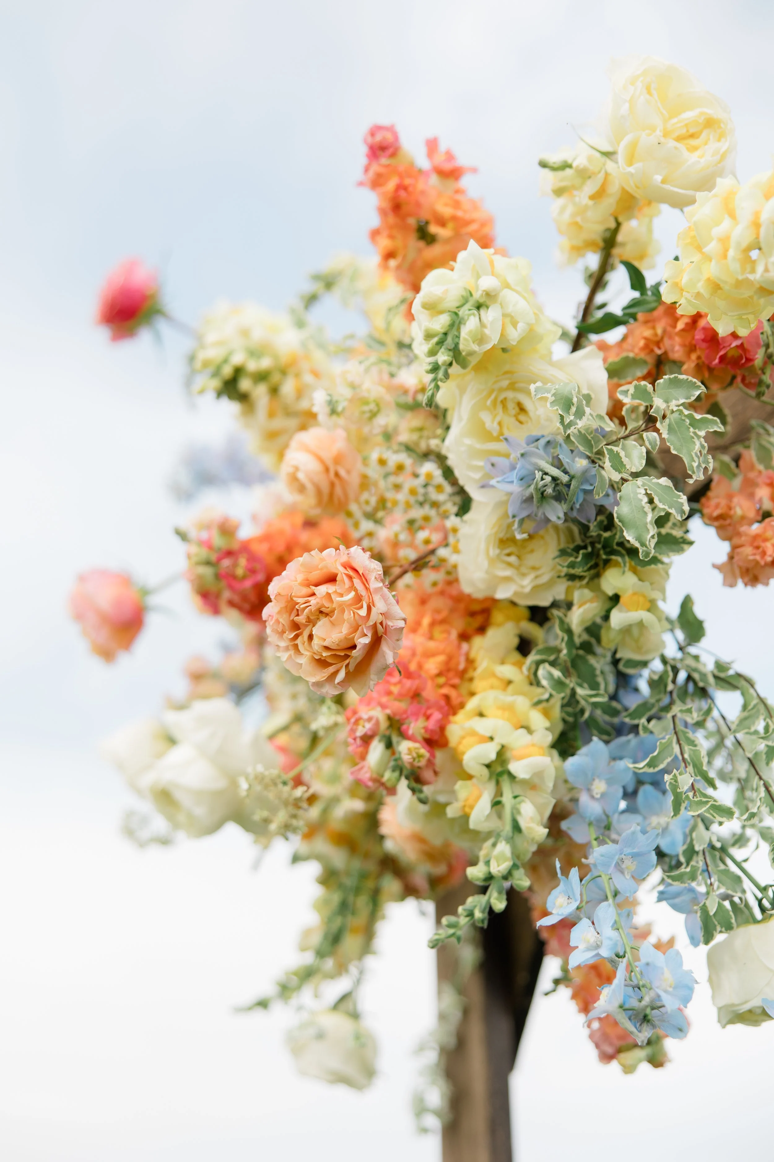 Colorful floral arrangement with roses, sunflowers, delphiniums, and greenery.