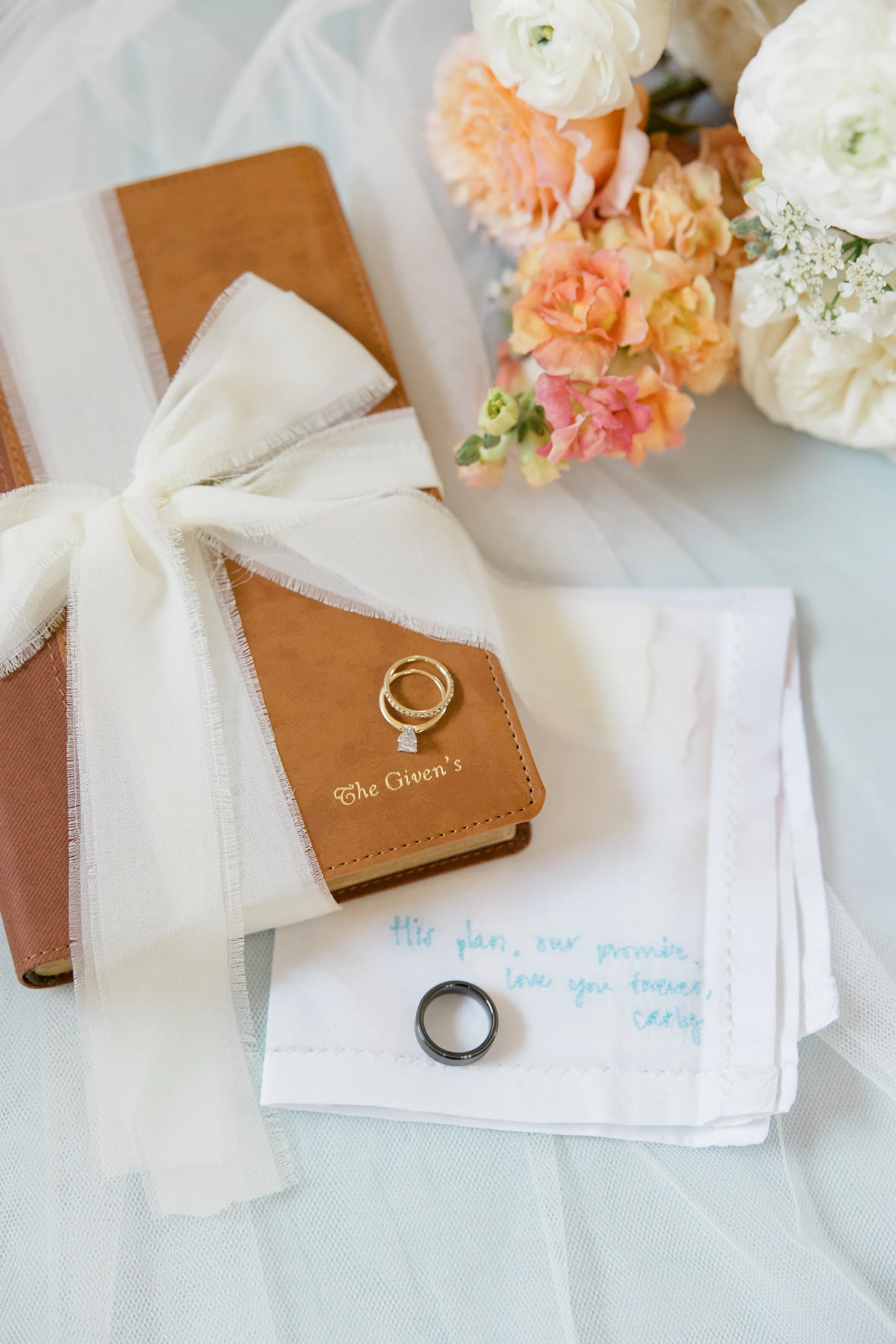 Bridal items on a decorative tray including white sandals, floral arrangement, perfume bottle, ring, earrings, and flowers.